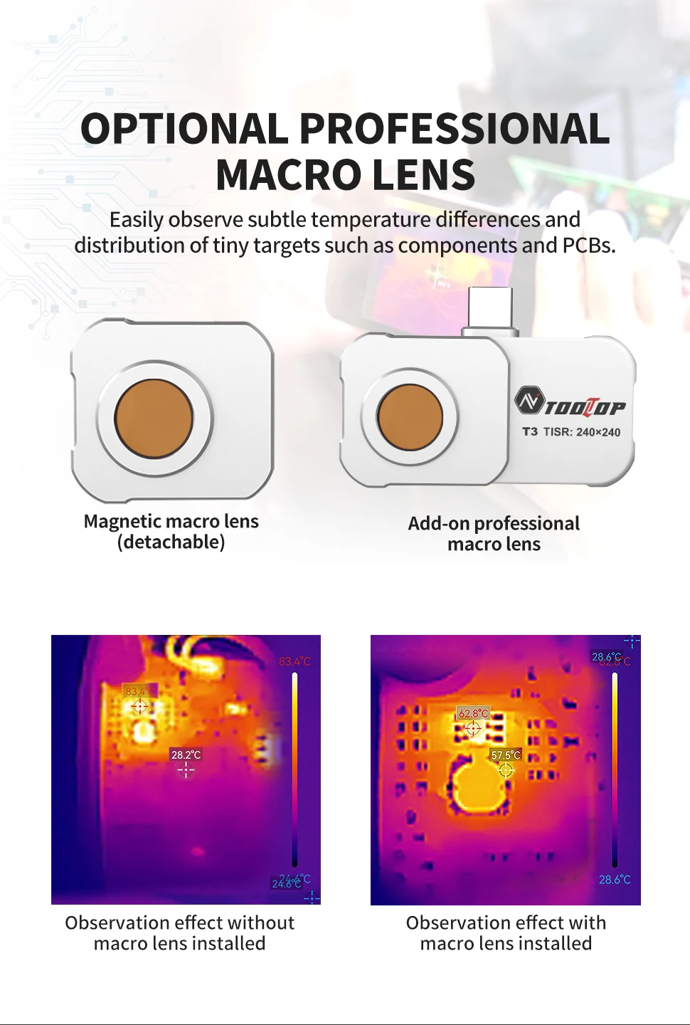 La lente macro magnética opcional puede observar fácilmente componentes pequeños