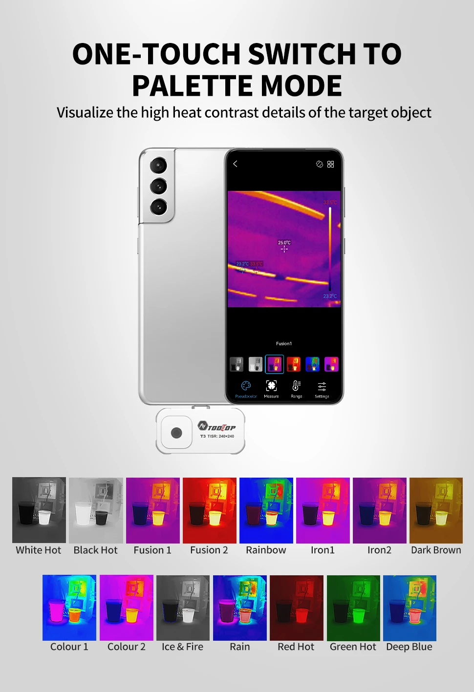 Paletas de colores: rojo caliente, arcoíris, lava, rojo hierro, negro caliente, blanco caliente, etc. Igual que la configuración actual