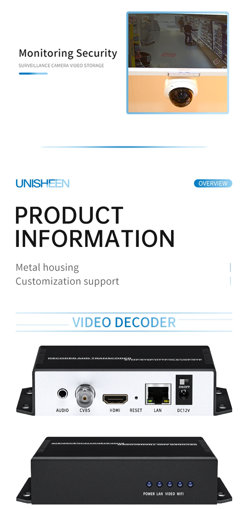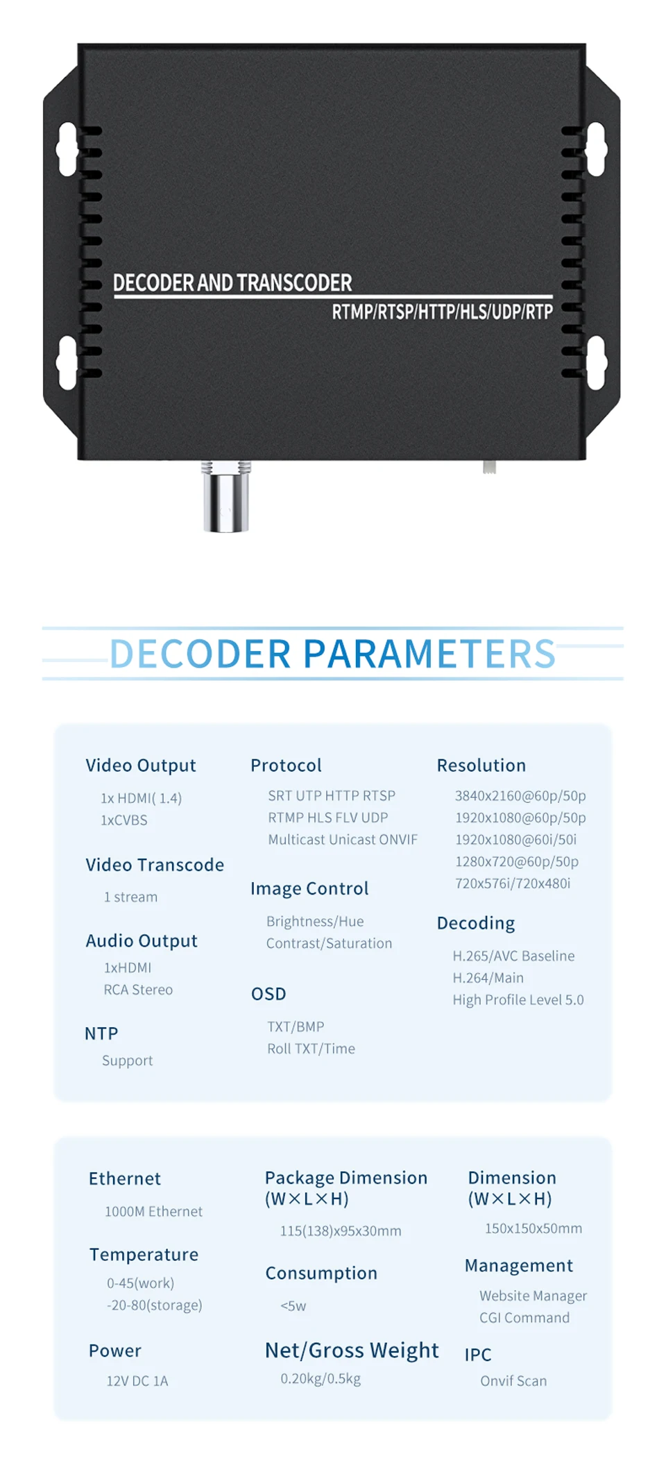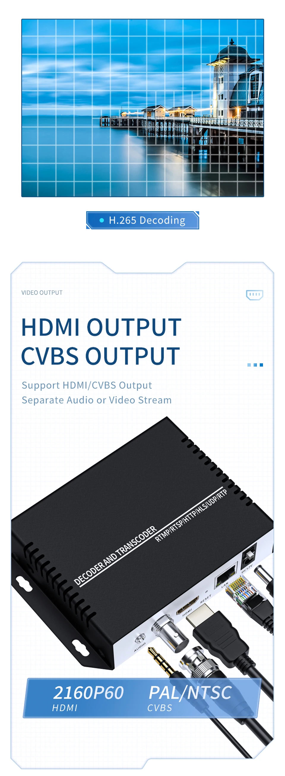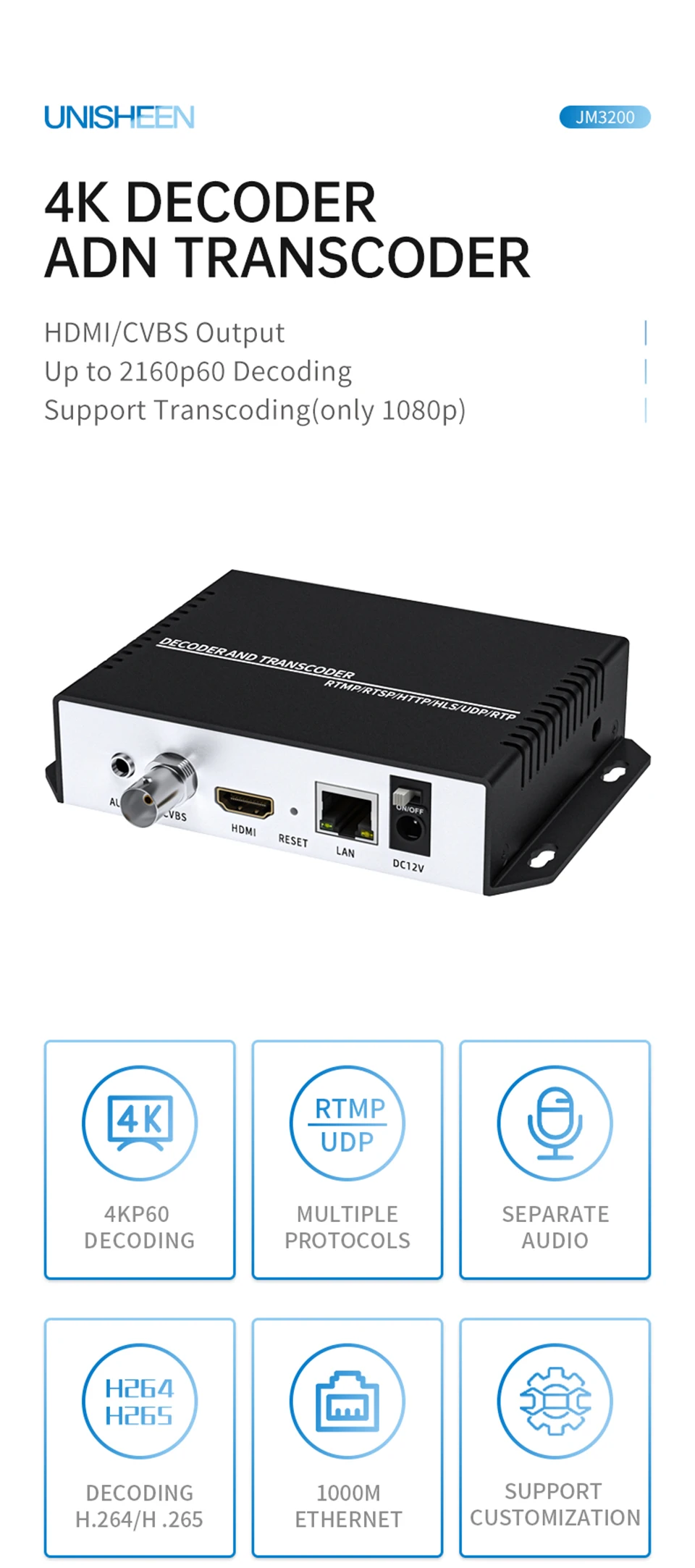 * Salida HDMI/CVBS * Salida de hasta 12160p60 * Decodificación de hasta 2160p60 * SRT/RTSP/RTMP/M3U8/UDP/ONVIF, etc. * Protocolo privado de baja latencia UTP * Soporte de flujo entrelazado* OSD TXT/BMP/Roll TXT * Admite transcodificación (solo 1080p)* Brillo/Contraste/Tono/Saturación * Personalizable