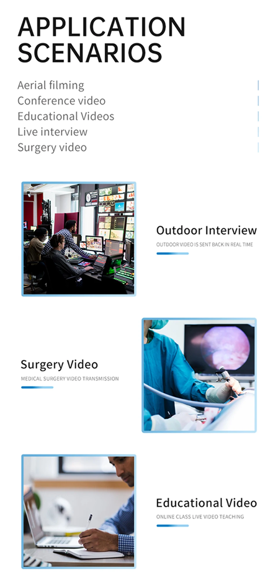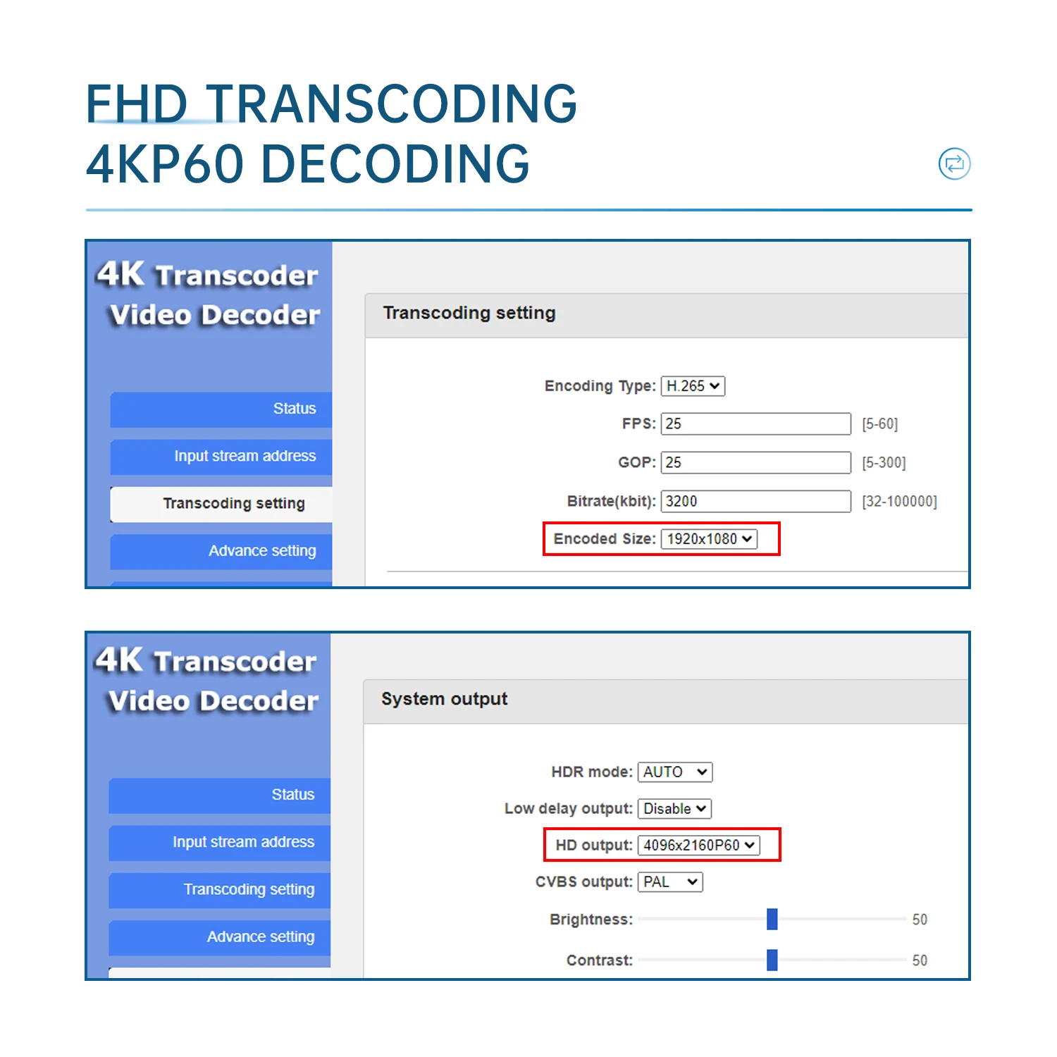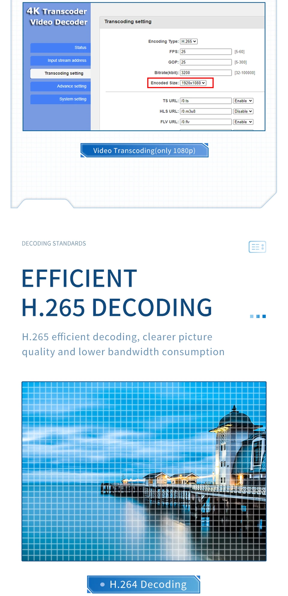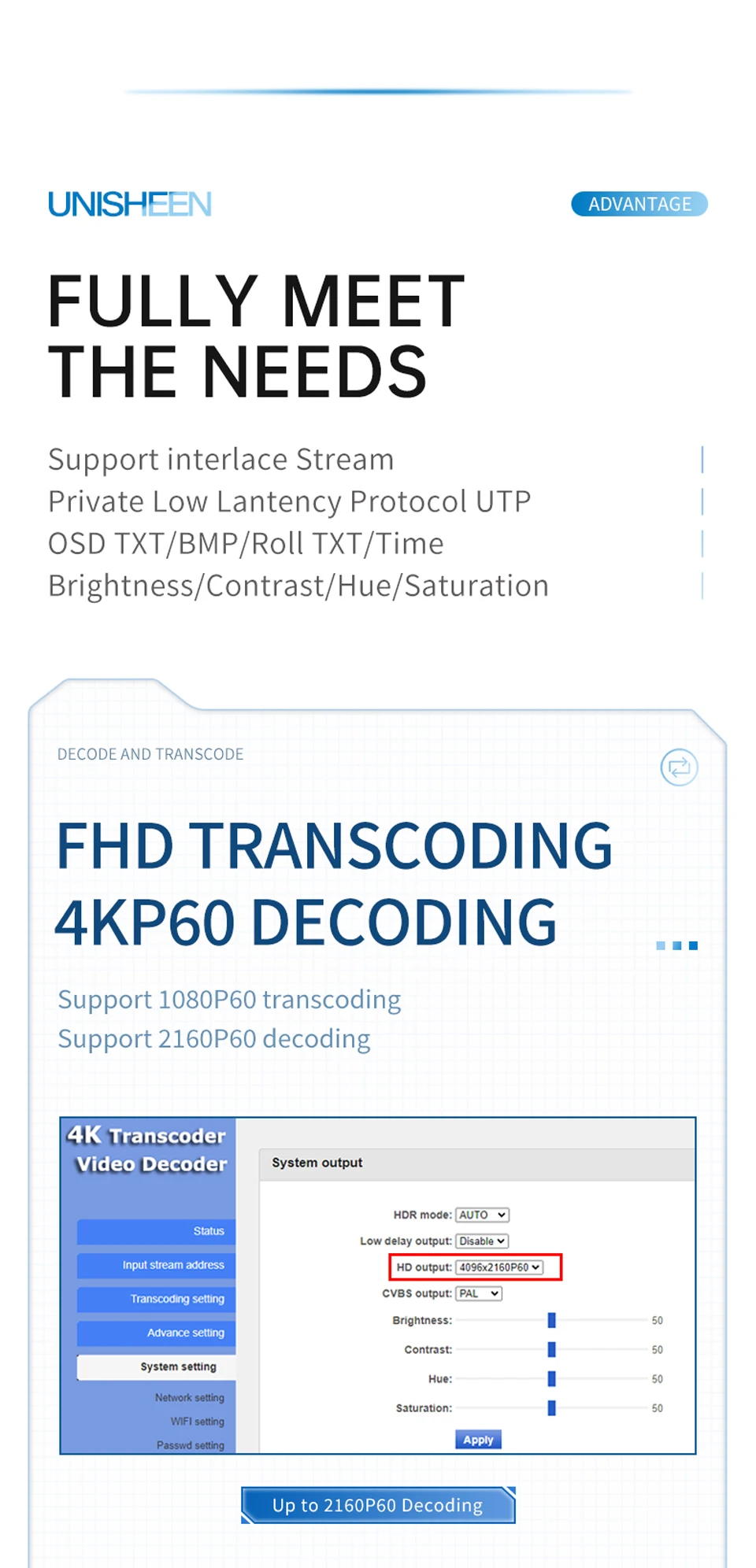 * Salida HDMI/CVBS * Salida de hasta 12160p60 * Decodificación de hasta 2160p60 * SRT/RTSP/RTMP/M3U8/UDP/ONVIF, etc. * Protocolo privado de baja latencia UTP * Soporte de flujo entrelazado* OSD TXT/BMP/Roll TXT * Admite transcodificación (solo 1080p)* Brillo/Contraste/Tono/Saturación * Personalizable