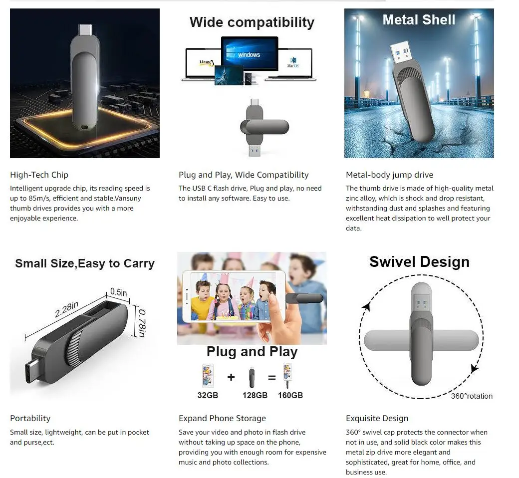 【Easy to Use】Plug and play, no need for extra software. Fully compatible with Windows, MAC, Android, and Linux systems, this USB Type C memory stick would automatically back up your music, videos, movies, photos and files.