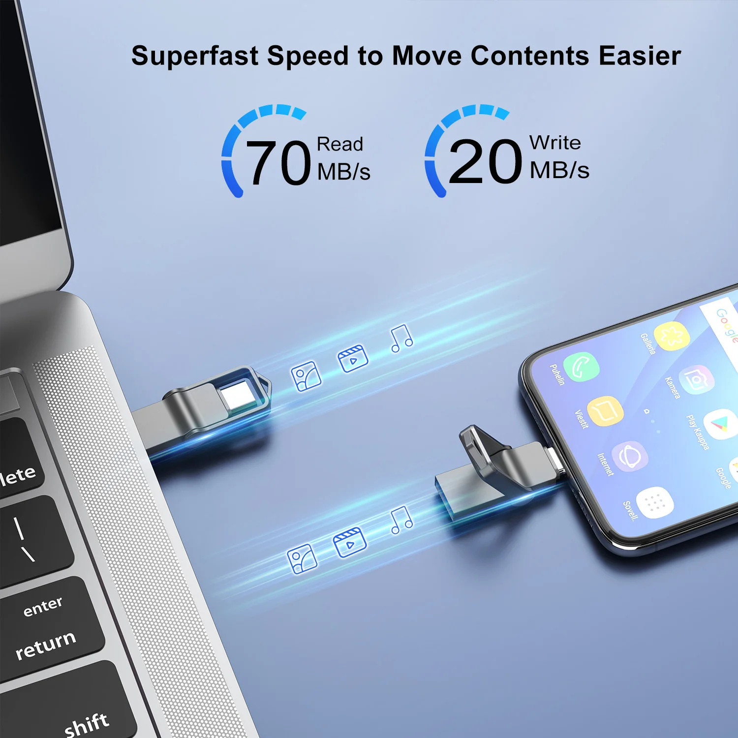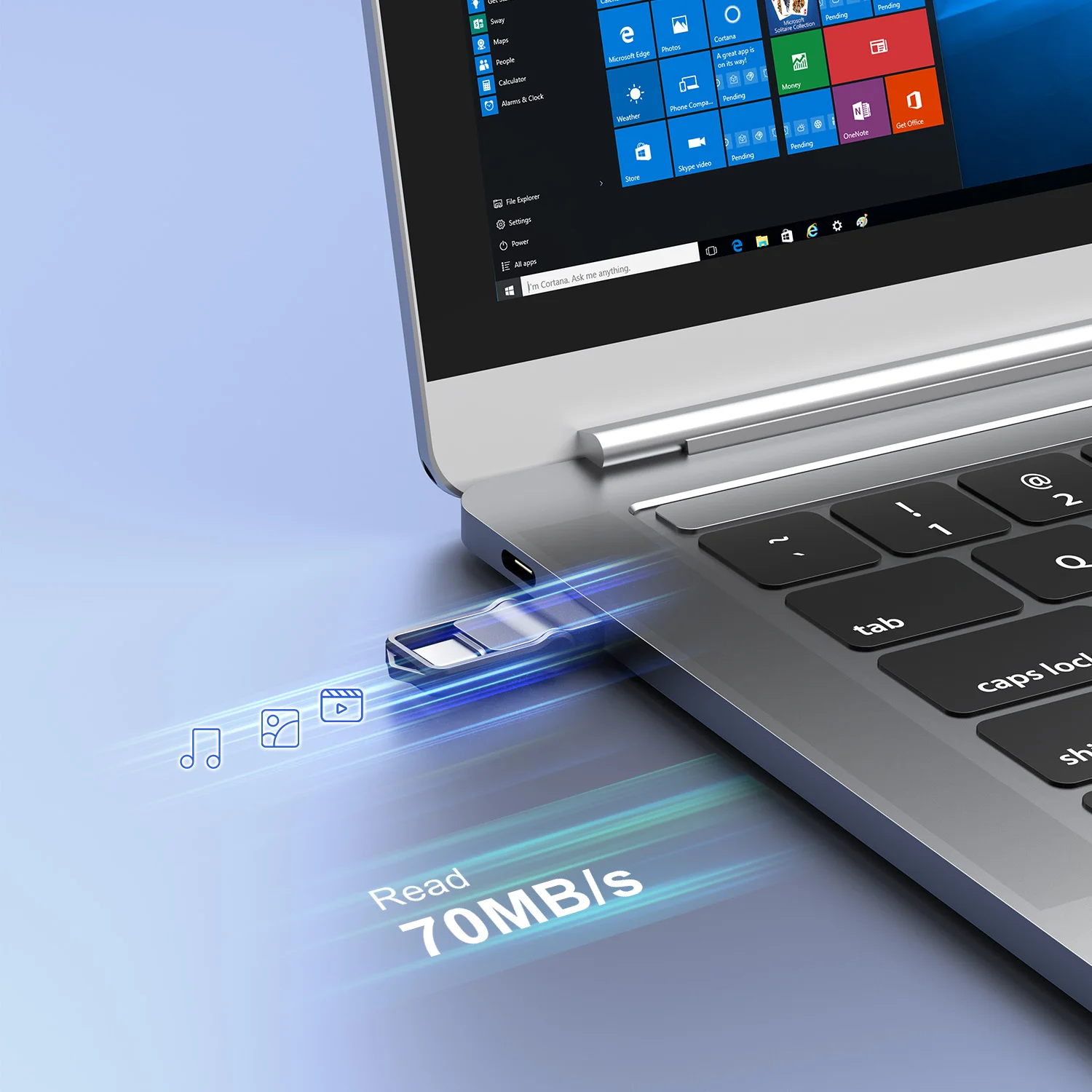Both USB-A and Type-C connectors of this 64GB flash drive optimize USB 3.0 performance to boost up to 60MB/s read speed and 15MB/s write speed, letting you quickly and easily move and back up your high-res photos, full HD/4K movies, and music.