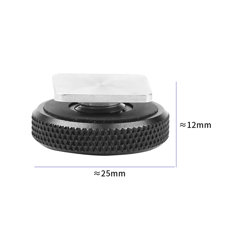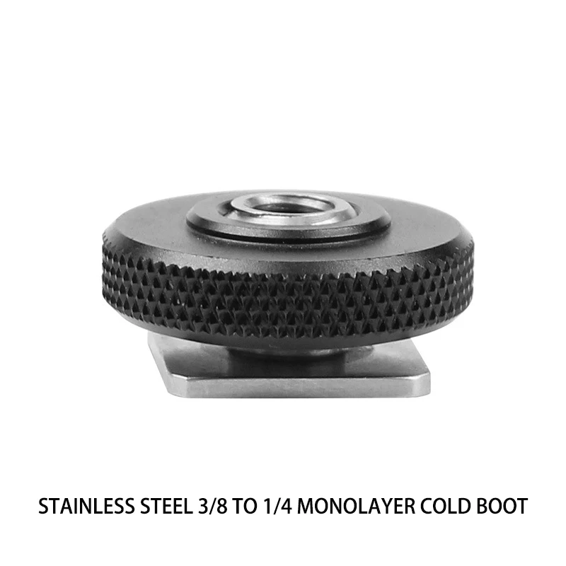 Tornillo adaptador de rosca de acero inoxidable de 3/8 "a 1/4" pulgadas Asiento de soporte de montaje de zapata fría de una sola capa para jaula de cámaras DSLR Nombre del artículo: Asiento de zapata fría de una sola capa con tuerca Material: tuerca de aleación de aluminio + asiento de zapata fría de acero inoxidable Color: negro Tecnología de superficie de aleación de aluminio: arenado anódico y oxidación Tamaño del producto: 12mm * 25mm Peso del producto/G: 15g Características: 1. La tuerca antiaflojamiento está hecha de procesamiento CNC de aleación de aluminio aeroespacial, que es resistente y duradero; 2. Arenado y oxidación anodizado de alta gama, cómodo al tacto, no se desvanece y el color es duradero y; 3. Soporte universal de zapata Fría de una sola capa de acero inoxidable, Que se puede instalar en jaulas de conejo de cámara y cámaras con zapatos fríos; tornillo de 4,3/8 vueltas a orificio de tornillo de 1/4, fuerte capacidad de carga;