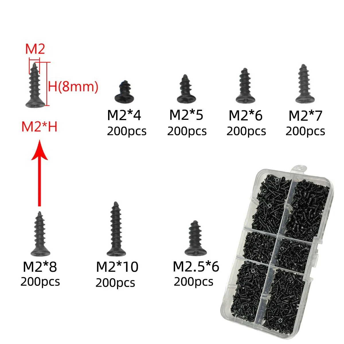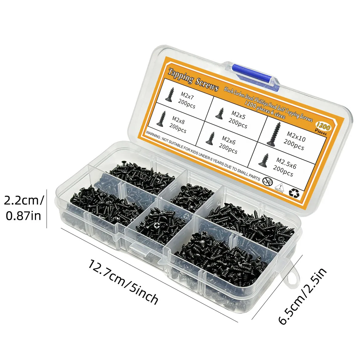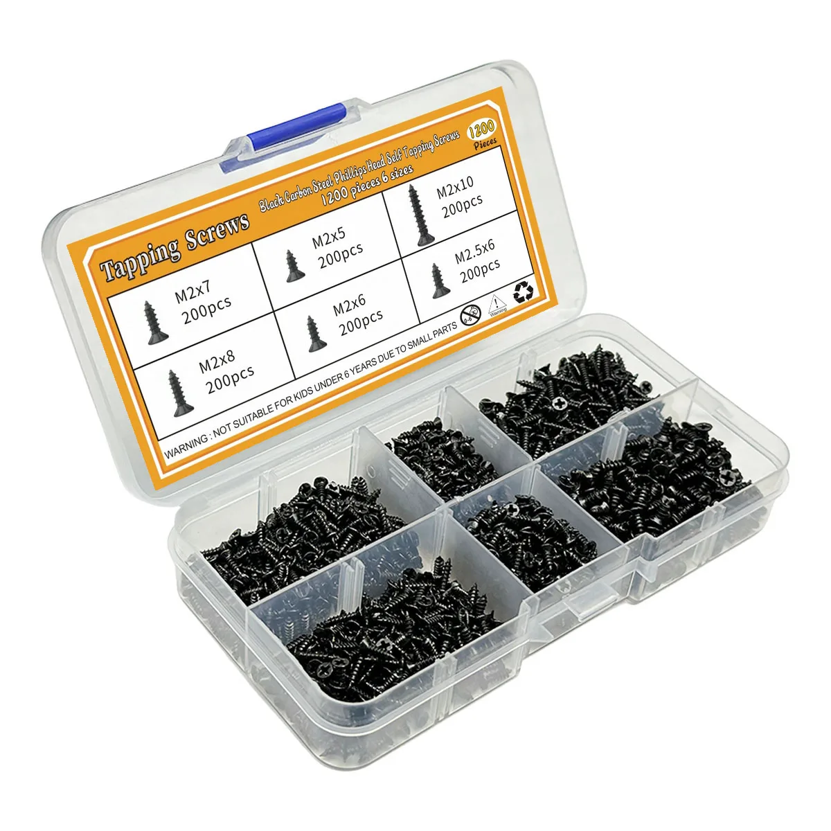 Comprar Tornillos de acero al carbono para madera, Kit surtido de Mini tornillos de cabeza plana Phillips, autorroscantes, 1200 piezas, M2, M2.5, 6 tamaños