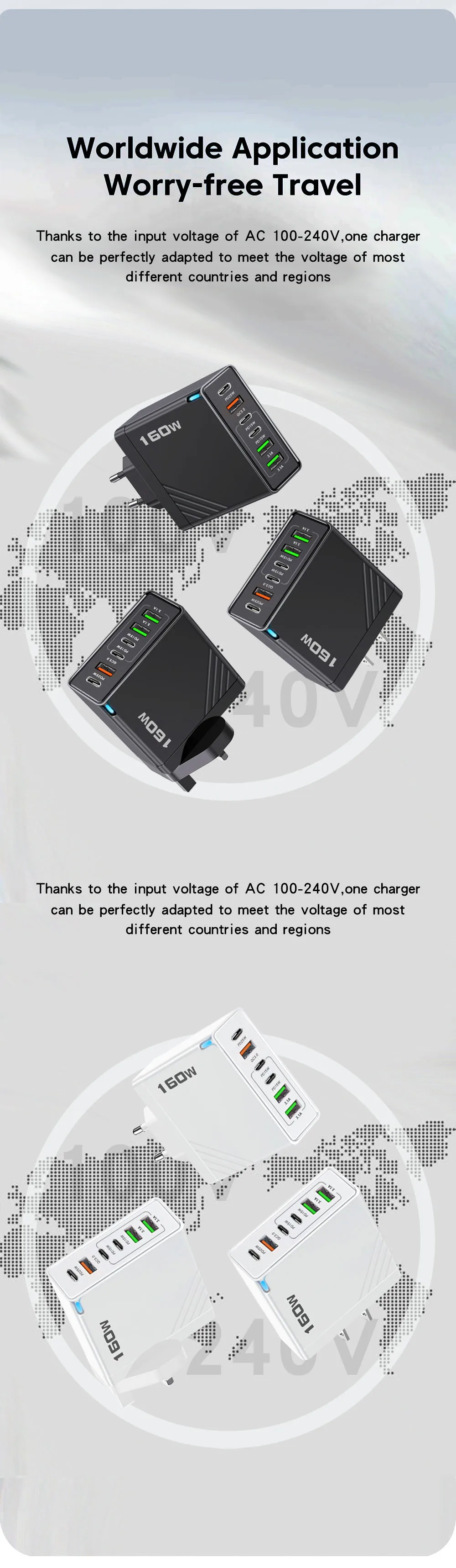 Cargador USB tipo C con múltiples puertos de 160W, adaptador de cargador de teléfono de carga rápida para iPhone, Samsung, Xiaomi, UE/EE. UU./Reino Unido, cargador de pared USB