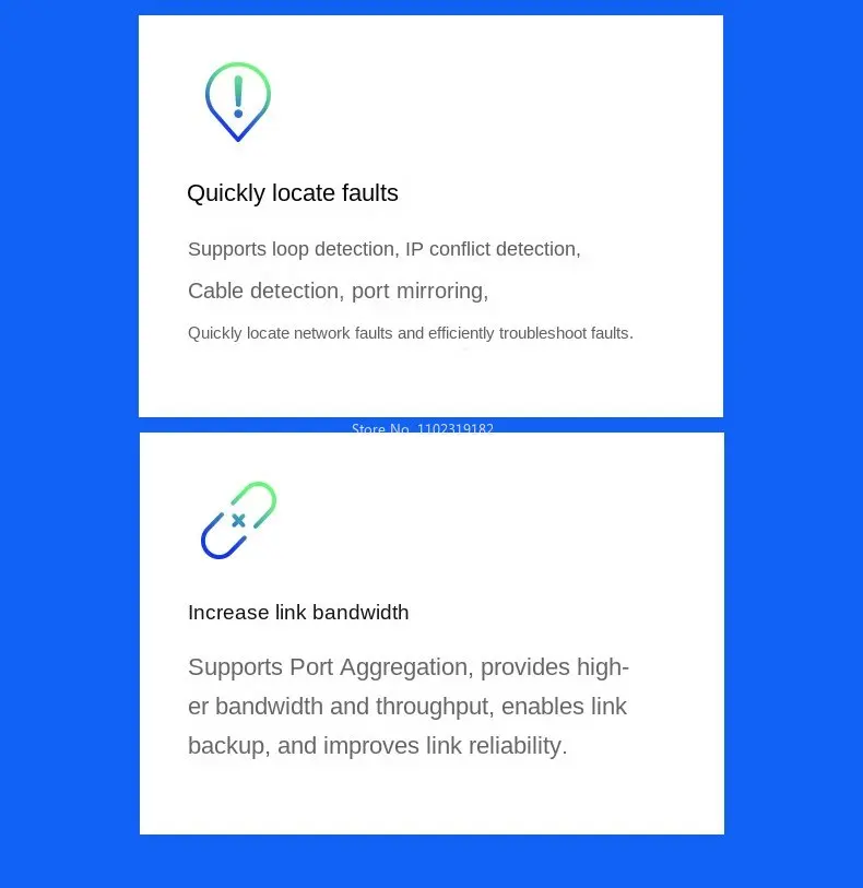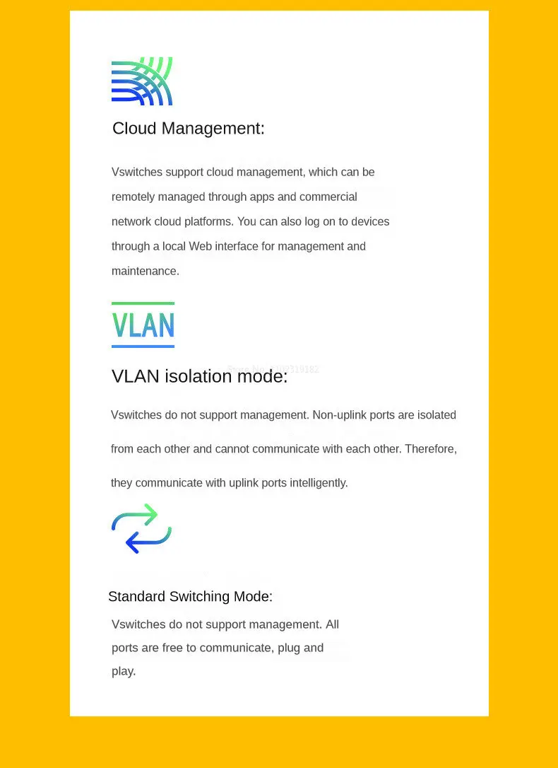Modo de aislamiento VLAN: el conmutador no admite la función de administración de red y algunos puertos están aislados entre sí.Consulte las instrucciones relevantes en el manual de instalación para obtener más detalles.