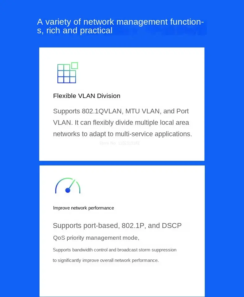 Modo de administración web: el conmutador admite VLAN, agregación de puertos, monitoreo de puertos y otras funciones de administración de red, y se puede administrar y mantener a través de una interfaz web o un software de administración de PC.