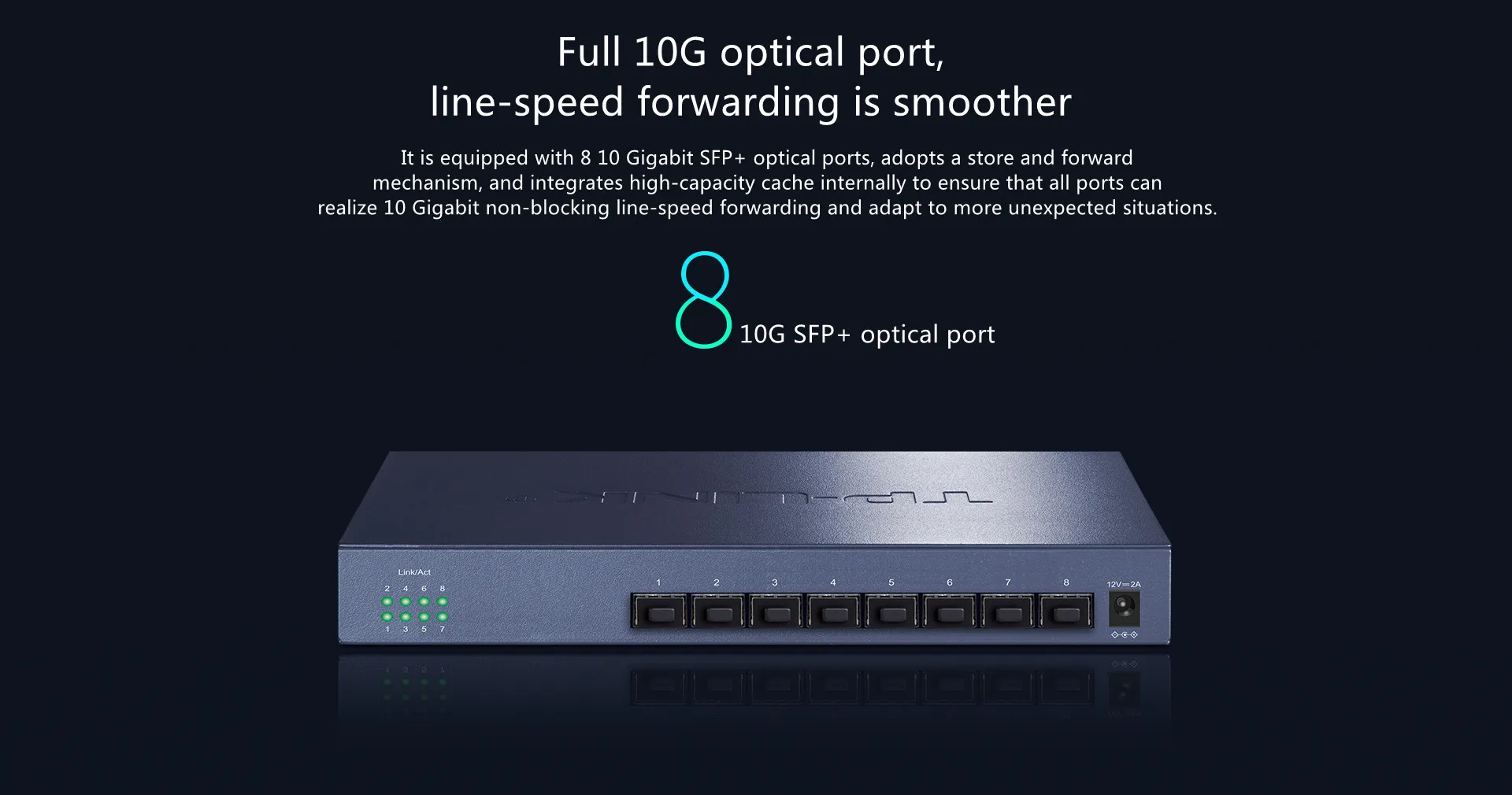 Se trata de un conmutador completamente no gestionado de 10 Gigabit, que proporciona 8 puertos ópticos SFP + de 10 Gigabit, todos los puertos admiten reenvío de velocidad de cable, plug and play.