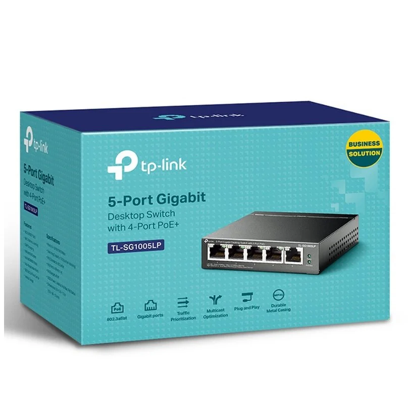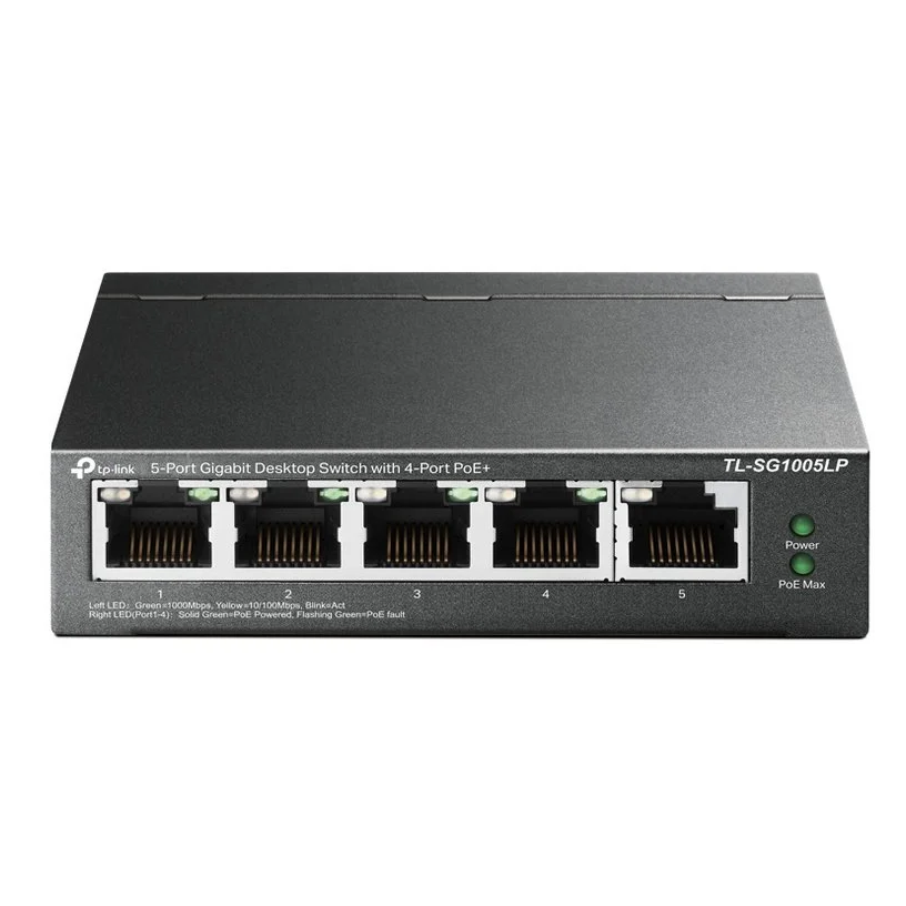 TP-Link TL-SG1005LP es un switch con 5 puertos Gigabit Ethernet, 4 de ellos PoE+, admite alimentación de hasta 30W por cada puerto PoE.