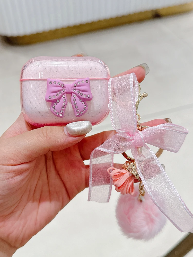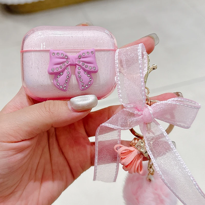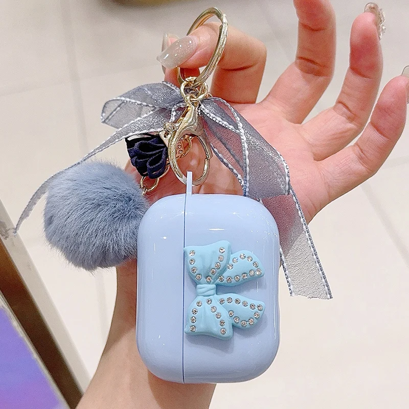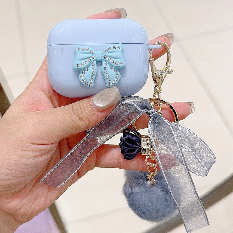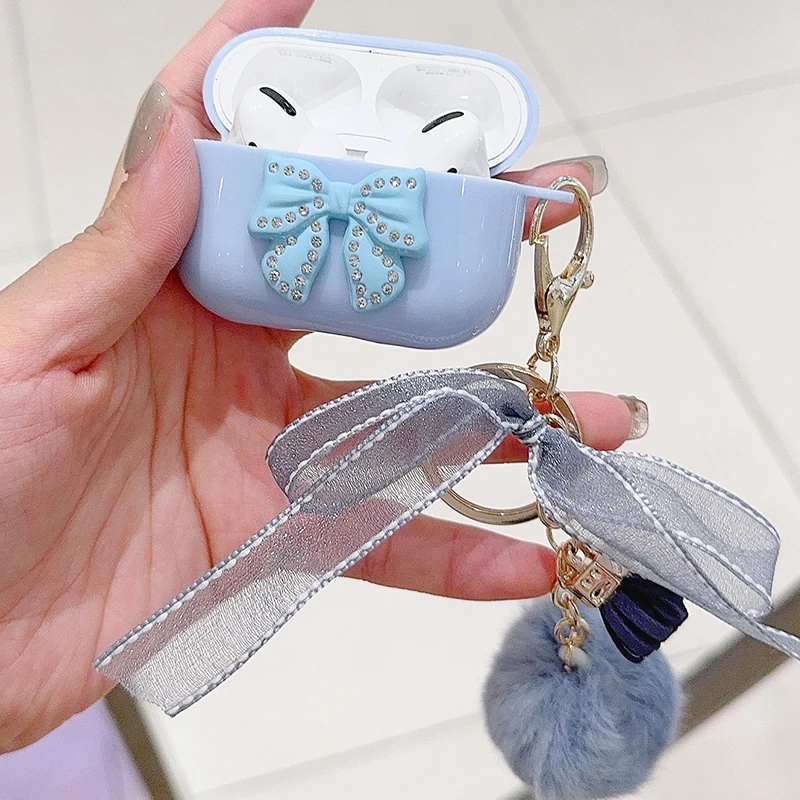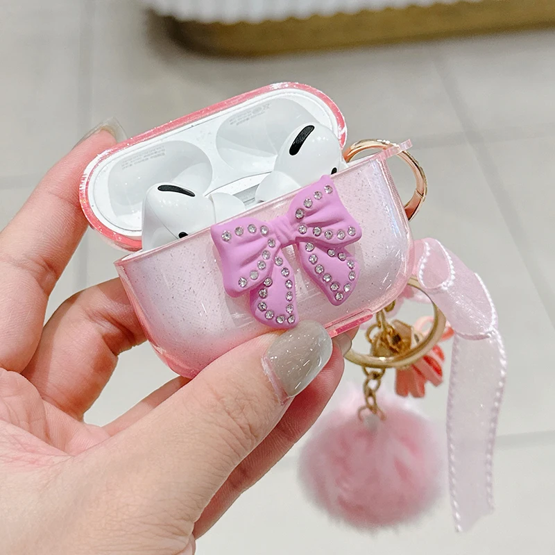 Trabajo hecho a mano lazo brillante con funda de lujo para Airpod Pro 2 Airpods 3 2 1 para mujeres con llavero de felpa cubierta de auriculares Bluetooth
