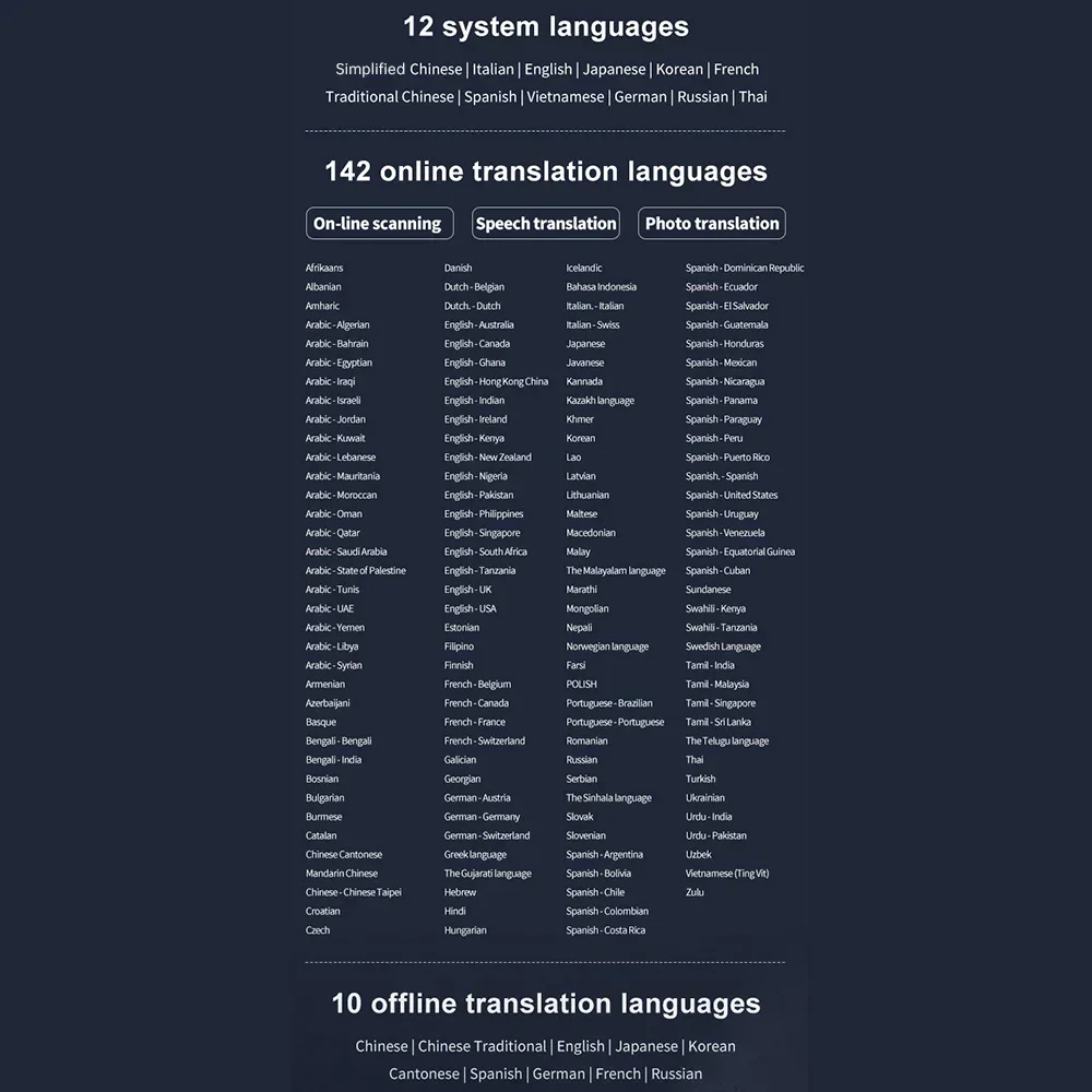 Capacidades de traducción multilingües: Equipado con 142 opciones de escaneo en línea/traducción de voz en línea/traducción de fotografías en línea, el Escáner de lápiz de traducción satisface las diversas necesidades de traducción de idiomas.También admite escaneo pinyin para lograr traducciones precisas en diferentes idiomas.Además, ofrece 10 funciones de escaneo fuera de línea, lo que permite la traducción de texto sin necesidad de conexión a Internet.