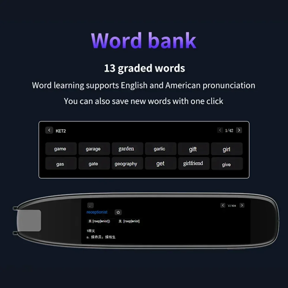 Herramienta de aprendizaje ideal: con su extensa colección de palabras en inglés y chino, así como poemas antiguos, el Scanner de lápiz de traducción sirve como una herramienta de aprendizaje ideal.Admite grabación de audio, reproducción de MP3 y reproducción de video, lo que permite a los usuarios mejorar su experiencia de aprendizaje de idiomas a través de funciones multimedia inmersivas.