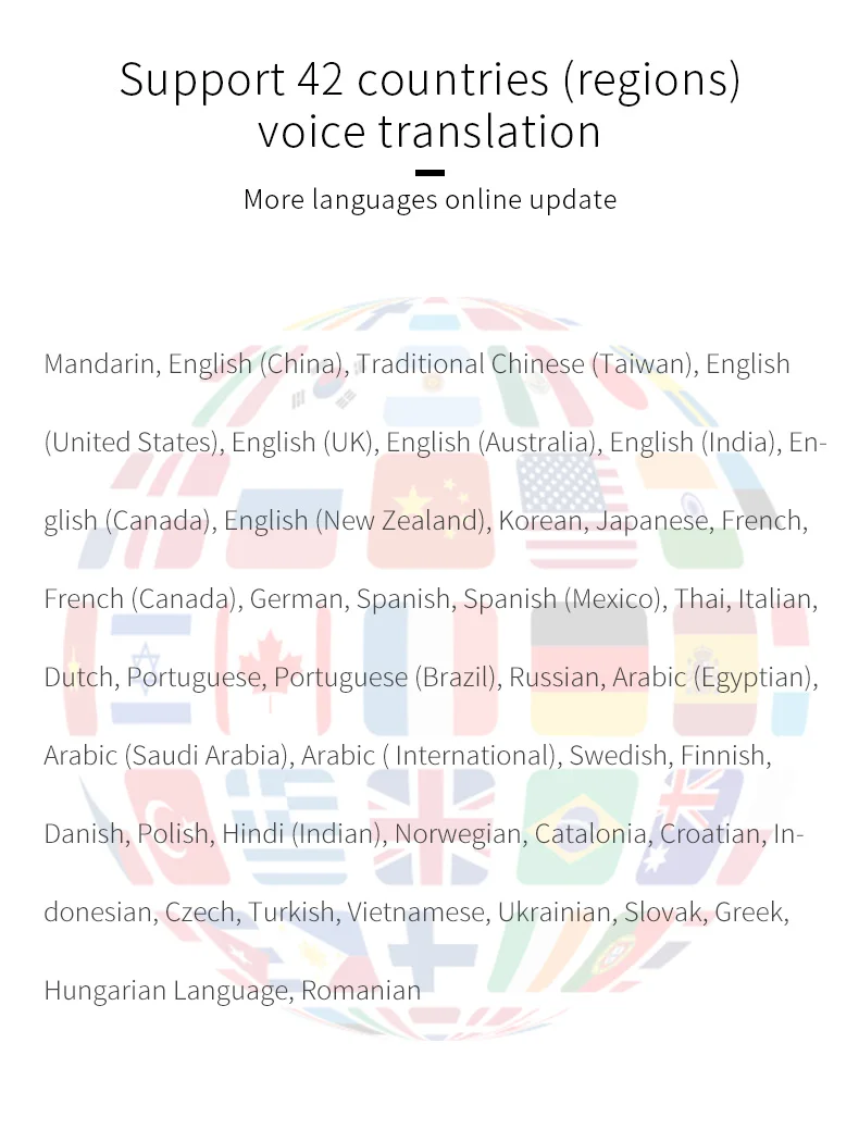 1.Traducción de voz instantánea: No hay necesidad de esperar, mantenga presionado el botón, diga lo que desea traducir y déjelo traducir al mismo tiempo.2.Traducción de fotografías: abra la aplicación móvil, use el teléfono móvil para tomar una foto e identificarla, la traducción es más conveniente.3.Traducción de la entrada de texto: ¿No se entienden la información del chat recibida?¿No puedo escribir?Copie directamente en el cuadro de entrada de texto de la aplicación y el texto traducido se podrá copiar nuevamente.4.Traducción de grabación: No es solo una máquina de traducción, sino también un bolígrafo de grabación.Después de grabar el texto, puede reconocer la traducción del texto.5.Altavoces de alta fidelidad: el efecto externo es claro y brillante, y el micrófono de reducción de ruido incorporado garantiza una entrada y reconocimiento de voz más precisos.6.Diseño ergonómico: pequeño y portátil, operación con una sola mano, puede llevarlo en el bolsillo.7.Escena aplicable: Adecuado para viajar al extranjero, evitar la comunicación basada en gestos, disfrutar del paisaje mundial, comer la comida mundial y preparar amigos extranjeros.Comunicación empresarial: Resolver problemas de idioma y facilitar la comunicación.8.Modo de espera prolongado: capacidad de la batería de 800 mAh, tiempo de espera de hasta 10 días, traducción continua durante 80 horas, tiempo de carga de 2 horas.Especificaciones:Tipo: Máquina de traducciónMétodo de conexión: conexión BluetoothDistancia efectiva: 10 mSistemas compatibles: Android 4.3 y superior, iOS 7.0 y superiorCapacidad de la batería: 800 mAhTiempo de traducción continua: 80 horasMaterial: ABSPeso: alrededor de 200 gTamaño: aproximadamente 136 mm * 36,3 mm * 12,3 mm/5,35 * 1,43 * 0,48 pulgadasFunción: Diálogo inteligente AI, traducción de voz, traducción de fotografías, traducción de texto, traducción de conversación remota, grabación a texto, traducción de grabaciónIntroducir cómo utilizar:(1) El teléfono móvil se conecta al Wifi o a la red móvil, escanea el código QR en el producto y descarga la aplicación de traducción del traductor;(2) Configure la aplicación de acuerdo con las instrucciones.(3) Presione el botón de encendido para encender el traductor; cuando abra la aplicación, escaneará y encontrará automáticamente el dispositivo "traductor".(4) Hay una barra de menú en la APLICACIÓN que puede seleccionar idiomas de hasta 42 países.(5) Seleccione el idioma traducido, presione el botón A en la barra de traducción para comenzar a grabar, suelte el botón una vez finalizado el habla y vea el resultado de la traducción en la APLICACIÓN durante aproximadamente 1 segundo.El traductor reconoce el habla como texto y luego lo traduce en lengua extranjera y juega.Nota: asegúrese de la conexión de red de su teléfono.Cuando la red es deficiente, la traducción puede retrasarse o no funcionar.Lista de paquetes:1x traductor inteligente1x cable de carga USBLos idiomas admitidos son los siguientes:Mandarina, chino tradicional (Taiwán), inglés (Estados Unidos), inglés (Reino Unido), inglés (Australia), inglés (India), inglés (Canadá), inglés (Nueva Zelanda), coreano, japonés, francés, francés (Canadá), alemán, español, español (mésico), tailandés, italiano, holandés, portugués, portugués (Brasil), ruso, árabe (Egyptian), árabe (Árabe Saudita), árabe (Internacional), sueco, finlandés, dinastano, polaco,Notas:1.La función de traducción de voz necesita conectarse a la red móvil o WiFi.Asegúrese de que la red de su teléfono móvil esté conectada.Cuando la red es deficiente, la función de traducción puede retrasarse o no funcionar correctamente.2.Cuando utilice la función de traducción Bluetooth, hable después del tono de aviso, luego suelte el botón una vez finalizado el habla para asegurarse de que se complete la voz de la traducción reconocida.3.El texto que se muestra en la pantalla de la aplicación se puede utilizar para verificar si el resultado del reconocimiento es exacto.Preguntas y respuestas:1. ¿Necesita conectarse a Internet?