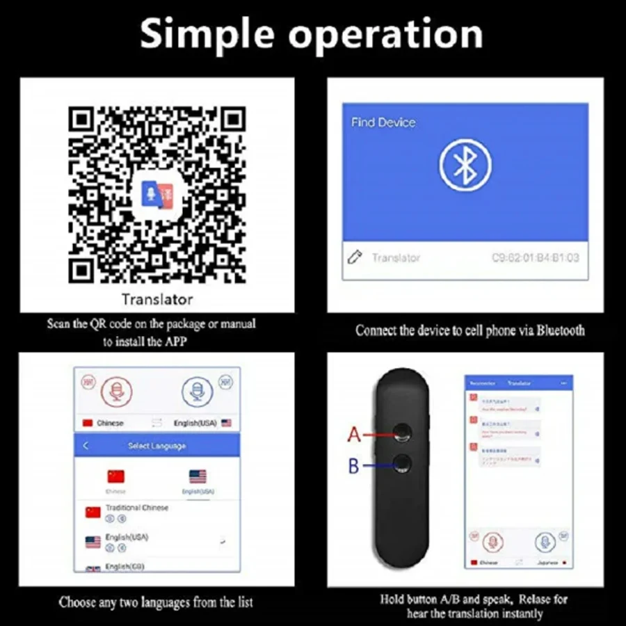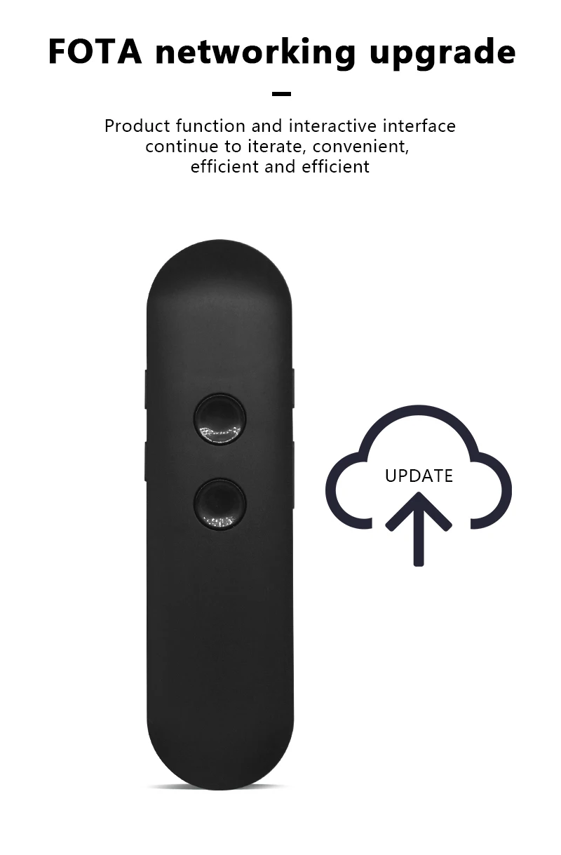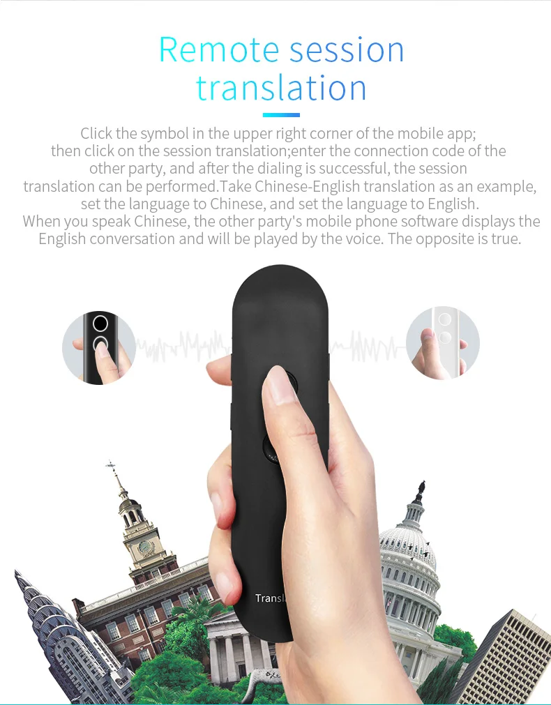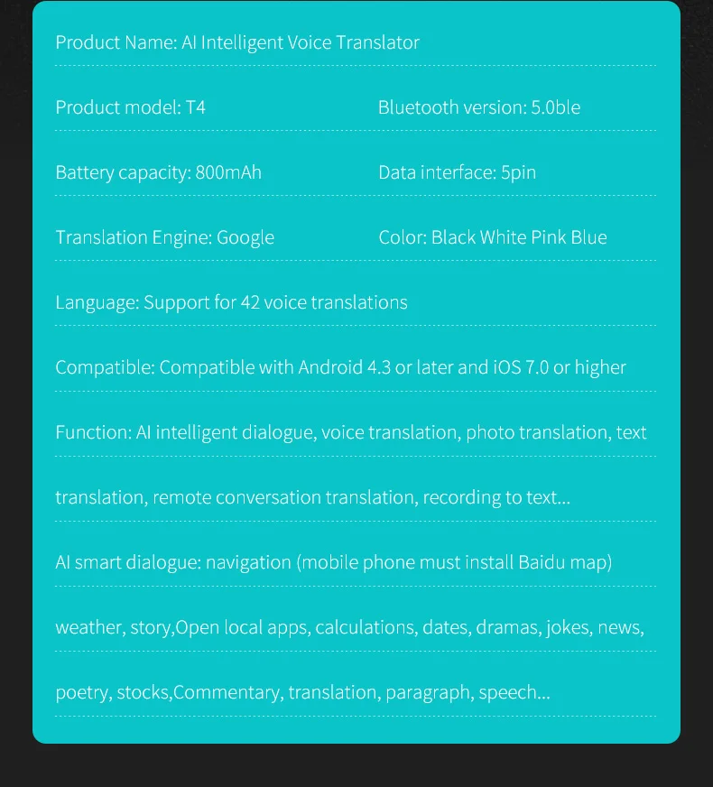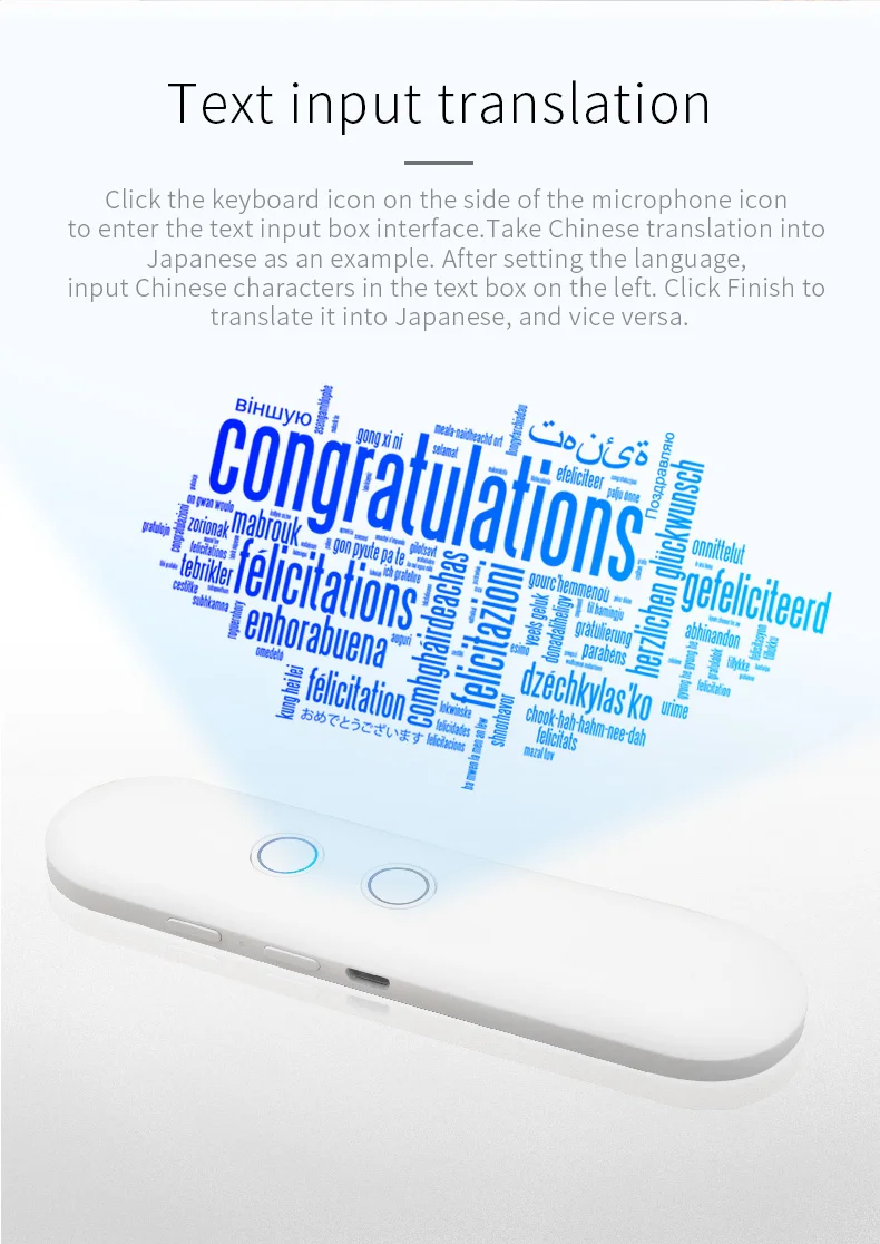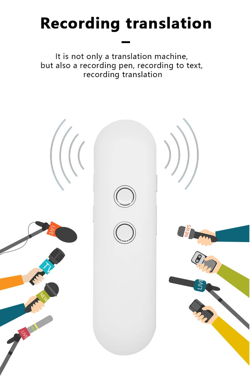 1.Traducción de voz instantánea: No hay necesidad de esperar, mantenga presionado el botón, diga lo que desea traducir y déjelo traducir al mismo tiempo.2.Traducción de fotografías: abra la aplicación móvil, use el teléfono móvil para tomar una foto e identificarla, la traducción es más conveniente.3.Traducción de la entrada de texto: ¿No se entienden la información del chat recibida?¿No puedo escribir?Copie directamente en el cuadro de entrada de texto de la aplicación y el texto traducido se podrá copiar nuevamente.4.Traducción de grabación: No es solo una máquina de traducción, sino también un bolígrafo de grabación.Después de grabar el texto, puede reconocer la traducción del texto.5.Altavoces de alta fidelidad: el efecto externo es claro y brillante, y el micrófono de reducción de ruido incorporado garantiza una entrada y reconocimiento de voz más precisos.6.Diseño ergonómico: pequeño y portátil, operación con una sola mano, puede llevarlo en el bolsillo.7.Escena aplicable: Adecuado para viajar al extranjero, evitar la comunicación basada en gestos, disfrutar del paisaje mundial, comer la comida mundial y preparar amigos extranjeros.Comunicación empresarial: Resolver problemas de idioma y facilitar la comunicación.8.Modo de espera prolongado: capacidad de la batería de 800 mAh, tiempo de espera de hasta 10 días, traducción continua durante 80 horas, tiempo de carga de 2 horas.Especificaciones:Tipo: Máquina de traducciónMétodo de conexión: conexión BluetoothDistancia efectiva: 10 mSistemas compatibles: Android 4.3 y superior, iOS 7.0 y superiorCapacidad de la batería: 800 mAhTiempo de traducción continua: 80 horasMaterial: ABSPeso: alrededor de 200 gTamaño: aproximadamente 136 mm * 36,3 mm * 12,3 mm/5,35 * 1,43 * 0,48 pulgadasFunción: Diálogo inteligente AI, traducción de voz, traducción de fotografías, traducción de texto, traducción de conversación remota, grabación a texto, traducción de grabaciónIntroducir cómo utilizar:(1) El teléfono móvil se conecta al Wifi o a la red móvil, escanea el código QR en el producto y descarga la aplicación de traducción del traductor;(2) Configure la aplicación de acuerdo con las instrucciones.(3) Presione el botón de encendido para encender el traductor; cuando abra la aplicación, escaneará y encontrará automáticamente el dispositivo "traductor".(4) Hay una barra de menú en la APLICACIÓN que puede seleccionar idiomas de hasta 42 países.(5) Seleccione el idioma traducido, presione el botón A en la barra de traducción para comenzar a grabar, suelte el botón una vez finalizado el habla y vea el resultado de la traducción en la APLICACIÓN durante aproximadamente 1 segundo.El traductor reconoce el habla como texto y luego lo traduce en lengua extranjera y juega.Nota: asegúrese de la conexión de red de su teléfono.Cuando la red es deficiente, la traducción puede retrasarse o no funcionar.Lista de paquetes:1x traductor inteligente1x cable de carga USBLos idiomas admitidos son los siguientes:Mandarina, chino tradicional (Taiwán), inglés (Estados Unidos), inglés (Reino Unido), inglés (Australia), inglés (India), inglés (Canadá), inglés (Nueva Zelanda), coreano, japonés, francés, francés (Canadá), alemán, español, español (mésico), tailandés, italiano, holandés, portugués, portugués (Brasil), ruso, árabe (Egyptian), árabe (Árabe Saudita), árabe (Internacional), sueco, finlandés, dinastano, polaco,Notas:1.La función de traducción de voz necesita conectarse a la red móvil o WiFi.Asegúrese de que la red de su teléfono móvil esté conectada.Cuando la red es deficiente, la función de traducción puede retrasarse o no funcionar correctamente.2.Cuando utilice la función de traducción Bluetooth, hable después del tono de aviso, luego suelte el botón una vez finalizado el habla para asegurarse de que se complete la voz de la traducción reconocida.3.El texto que se muestra en la pantalla de la aplicación se puede utilizar para verificar si el resultado del reconocimiento es exacto.Preguntas y respuestas:1. ¿Necesita conectarse a Internet?