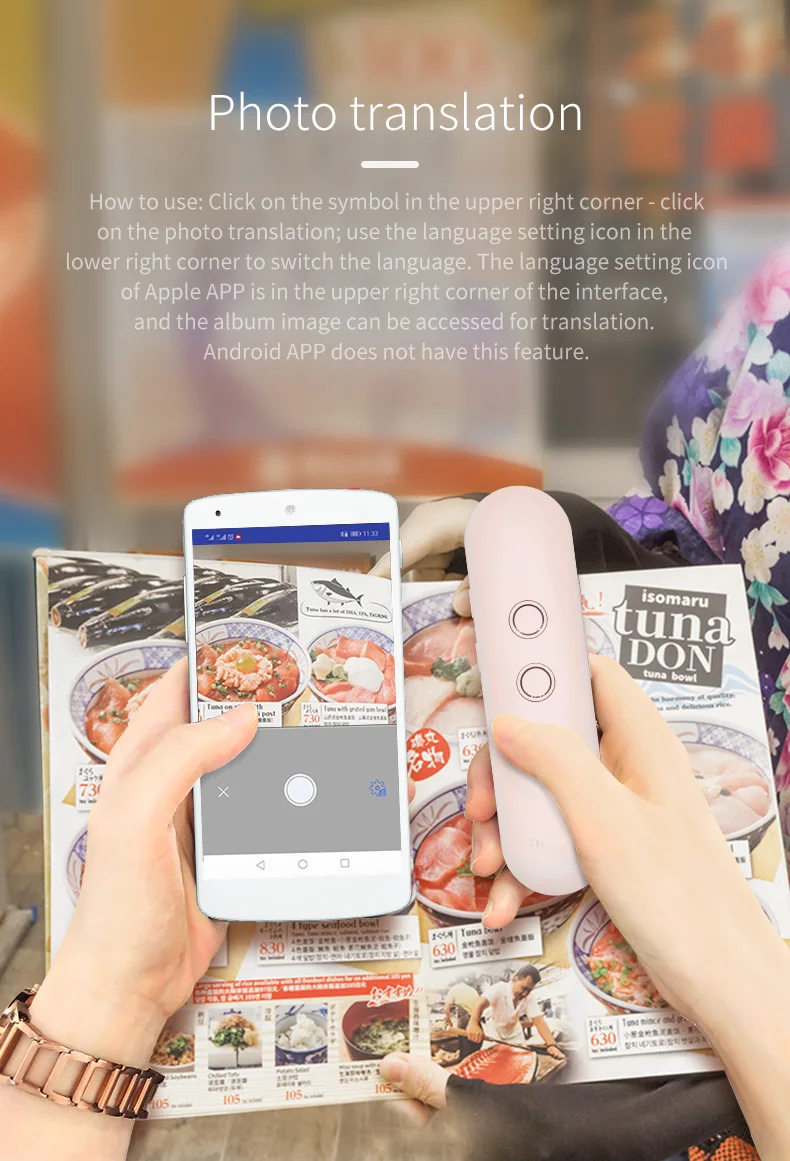 Conecte su teléfono, soporte de idiomas, traducción de texto y fotografías.