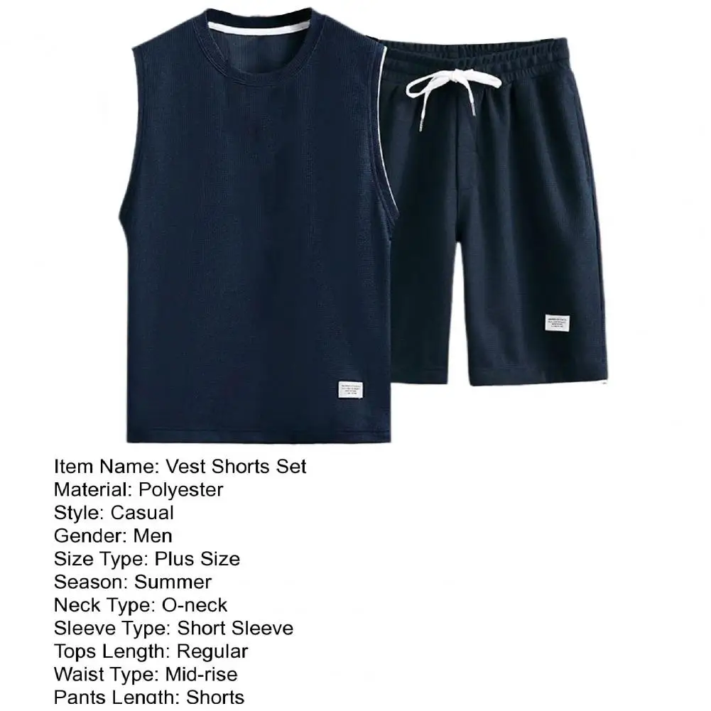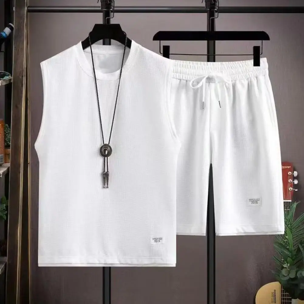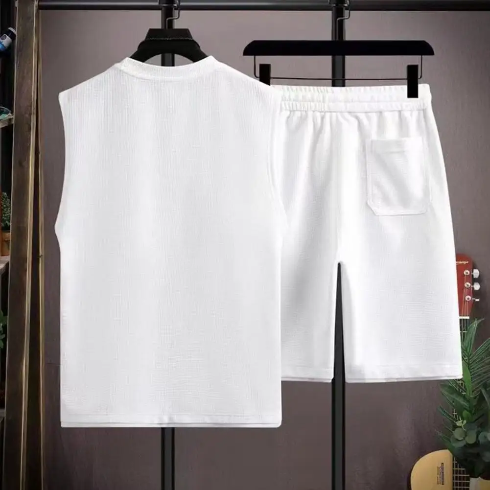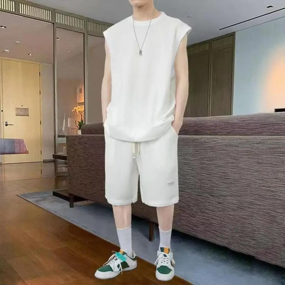 Traje deportivo para hombre, conjunto informal de verano con cuello redondo, chaleco sin mangas, cordón elástico en la cintura, pantalones cortos de pierna ancha, textura de gofre