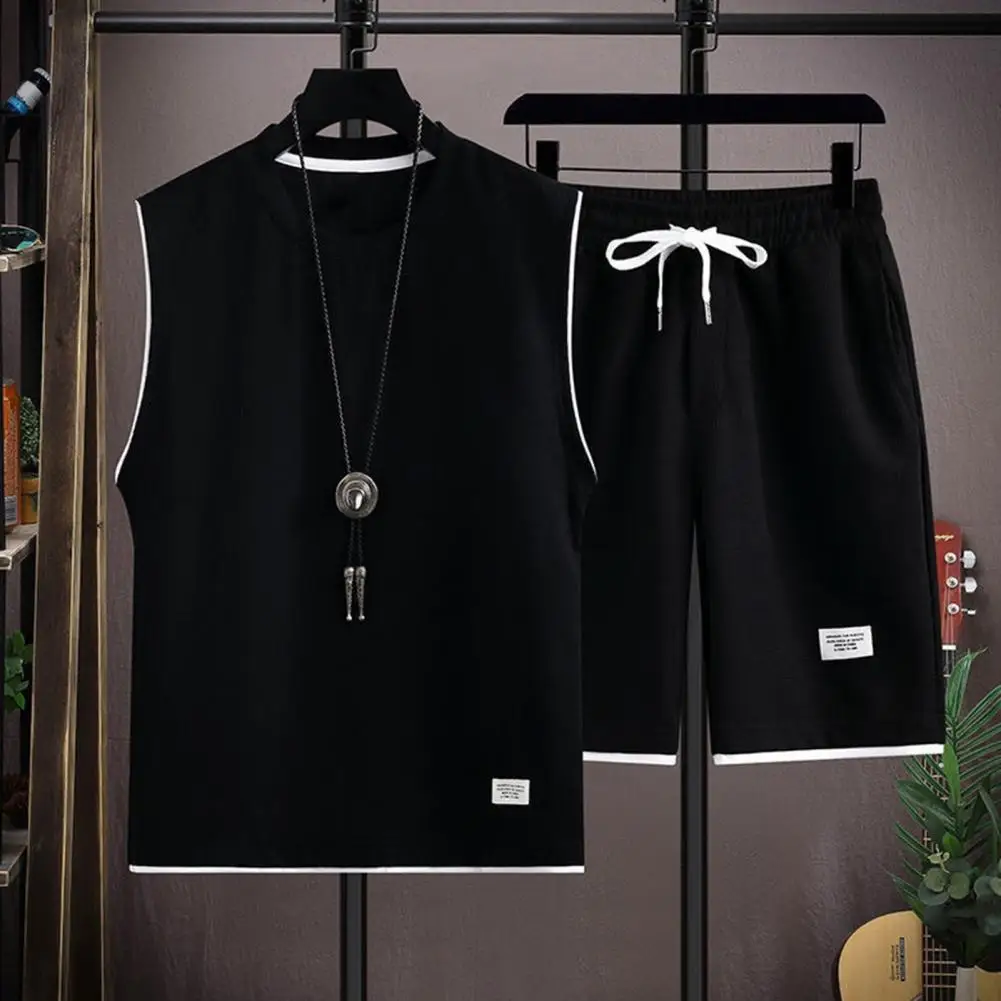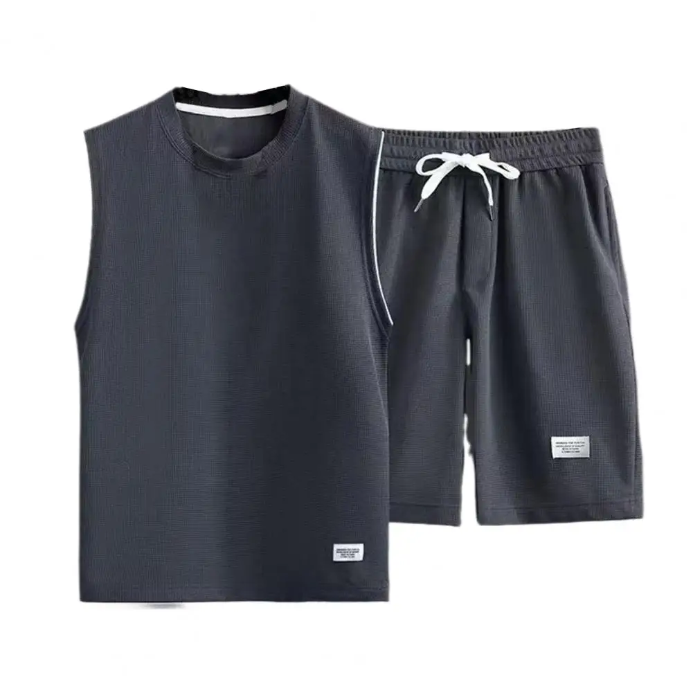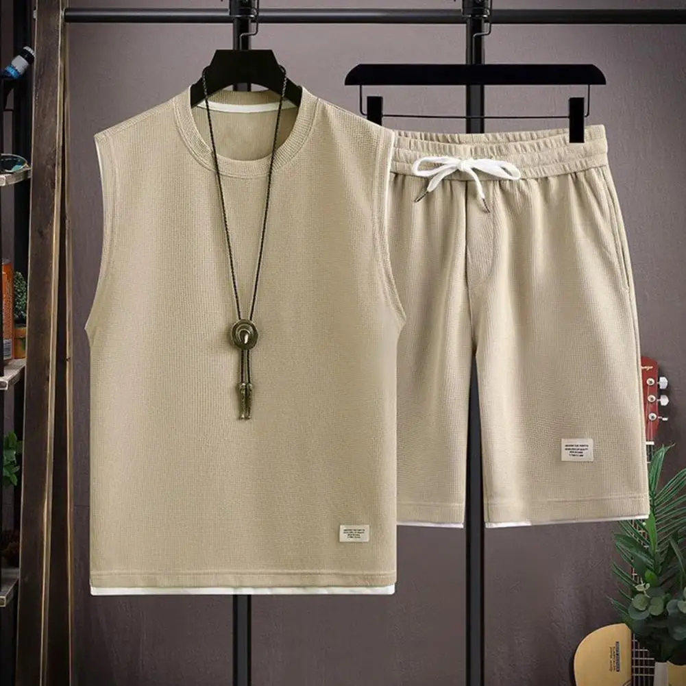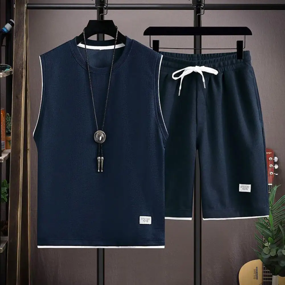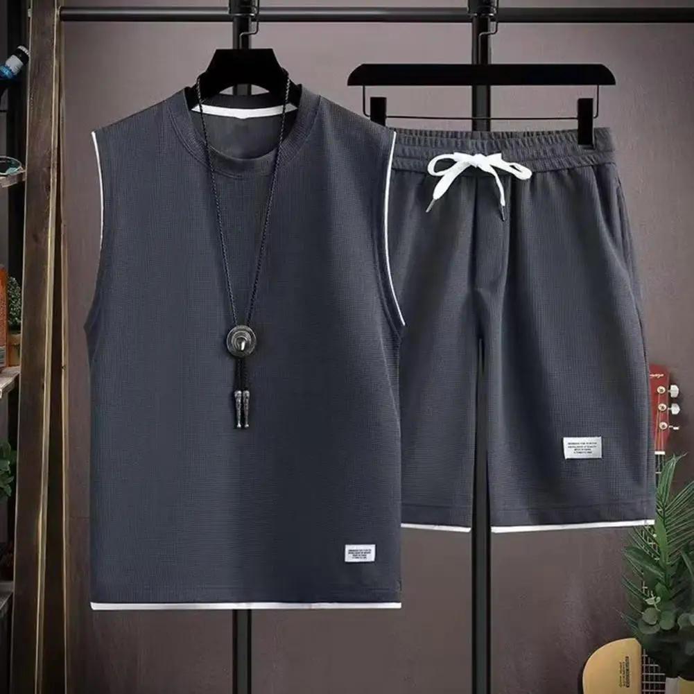 Traje deportivo para hombre, conjunto informal de verano con cuello redondo, chaleco sin mangas, cordón elástico en la cintura, pantalones cortos de pierna ancha, textura de gofre