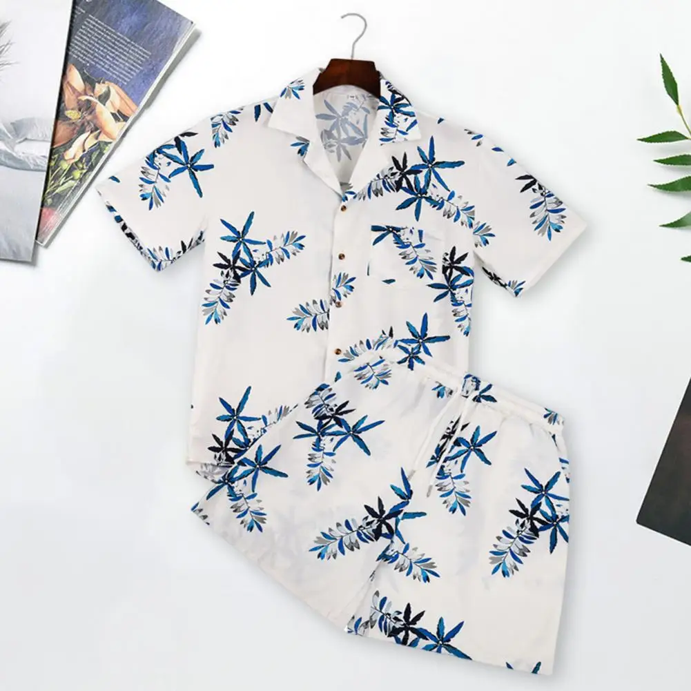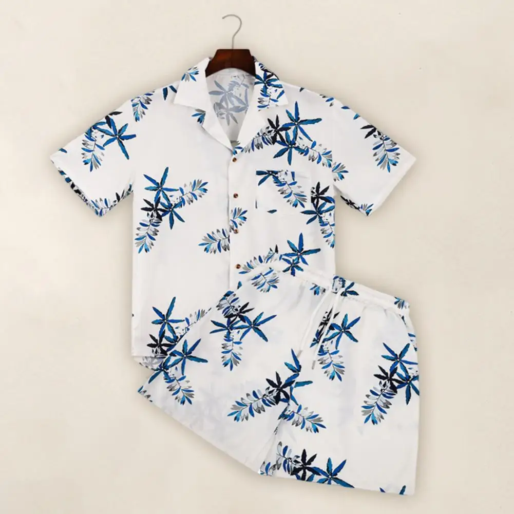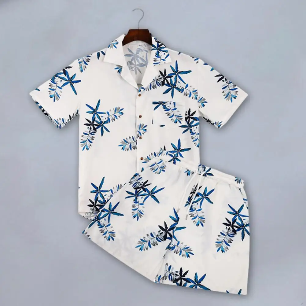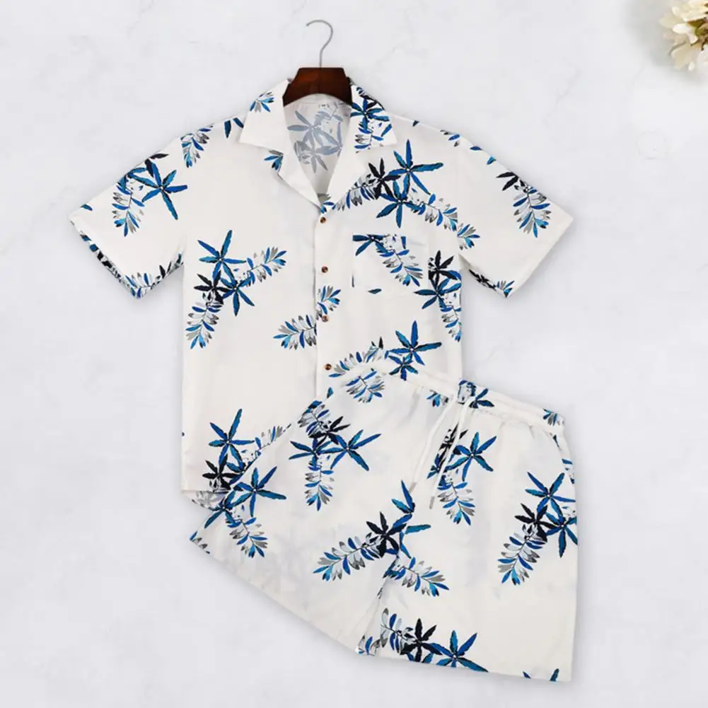 Traje con estampado tropical Camisa con estampado de hojas tropicales Conjunto de pantalones cortos Ropa de playa con solapa Top Cintura elástica Pantalones cortos Diseño botánico 2 unids/set
