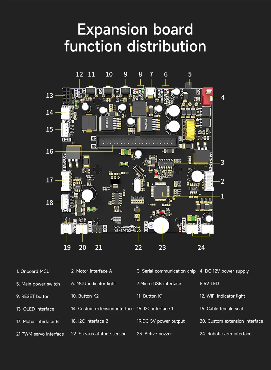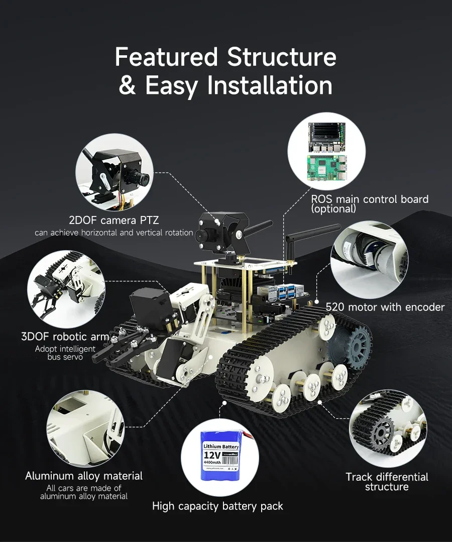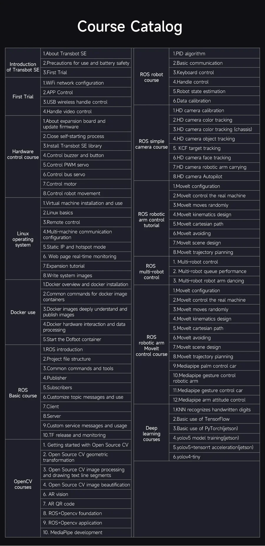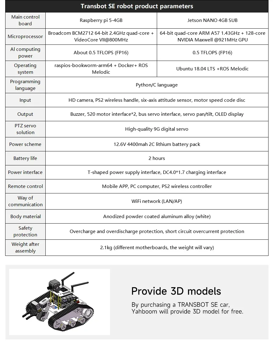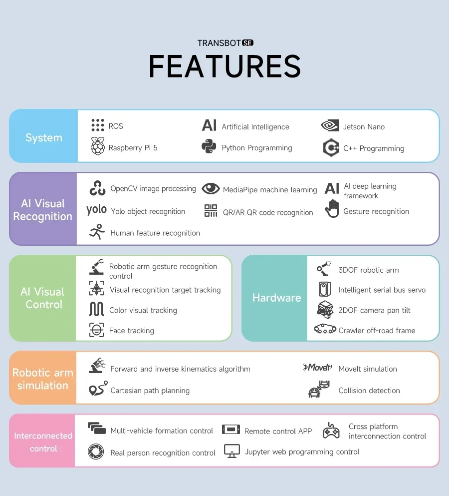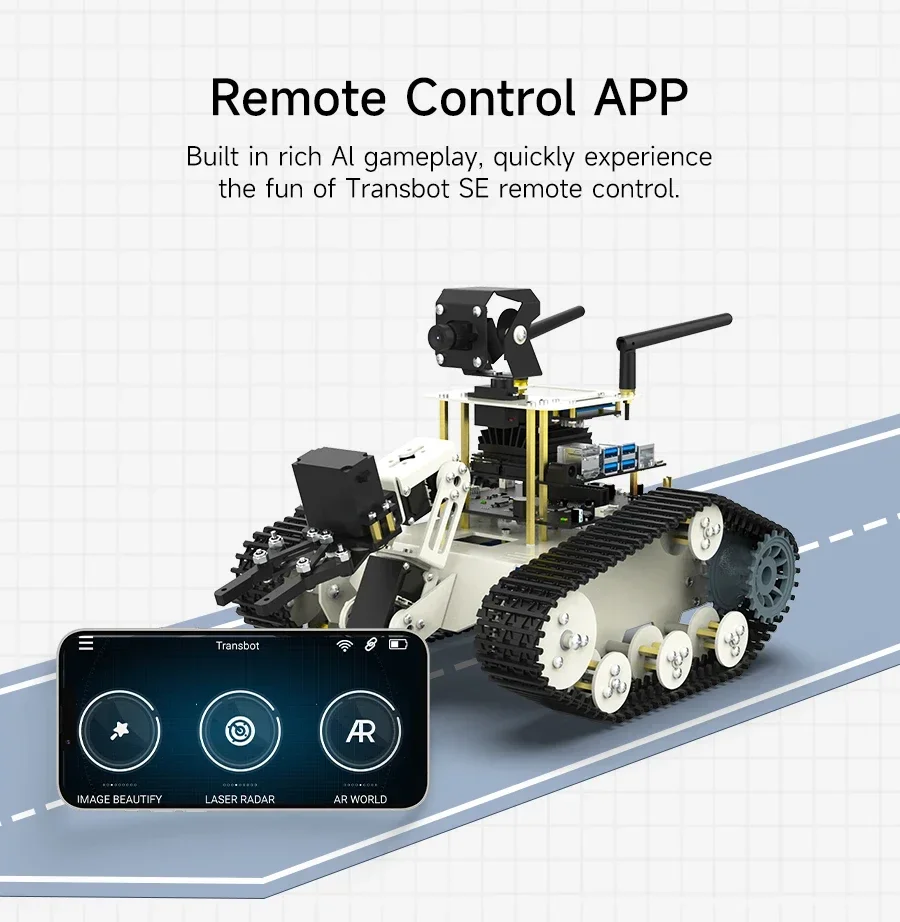 TRANSBOT-SE es un robot auto con orugas desarrollado en base al sistema operativo del robot.Todo el cuerpo está fabricado en aleación de aluminio.Equipado con un brazo robótico 3-DOF y una cámara PTZ 2-DOF, 520 motores codificadores y una batería de gran capacidad.Es compatible con Jetson Nano B01/SUB y Raspberry Pi 5.Algoritmo de procesamiento de imágenes OpenCV incorporado, aprendizaje automático MediaPipe, marco de aprendizaje profundo AI y plataforma de simulación de movelt, Transbot SE puede realizar funciones como control de movimiento del robot, reconocimiento de gestos, reconocimiento de objetos, seguimiento, conducción automática y control de simulación de brazo robótico.