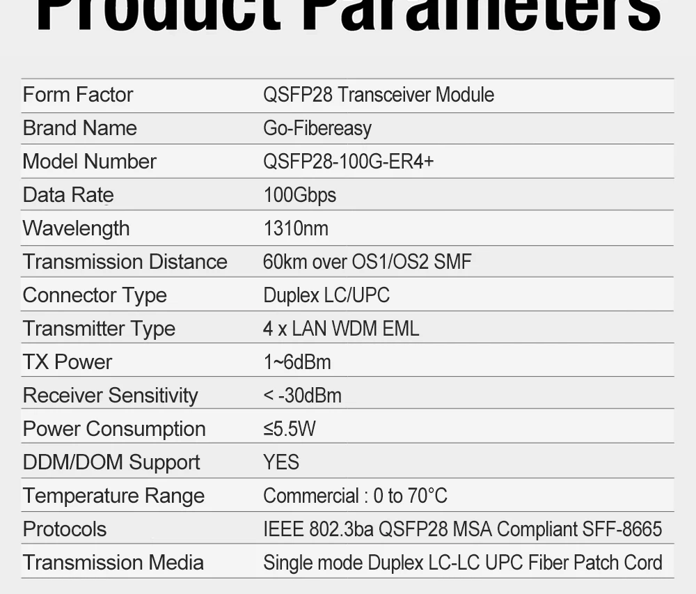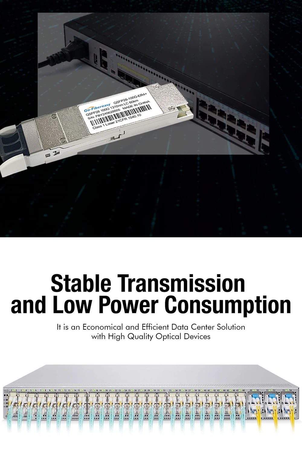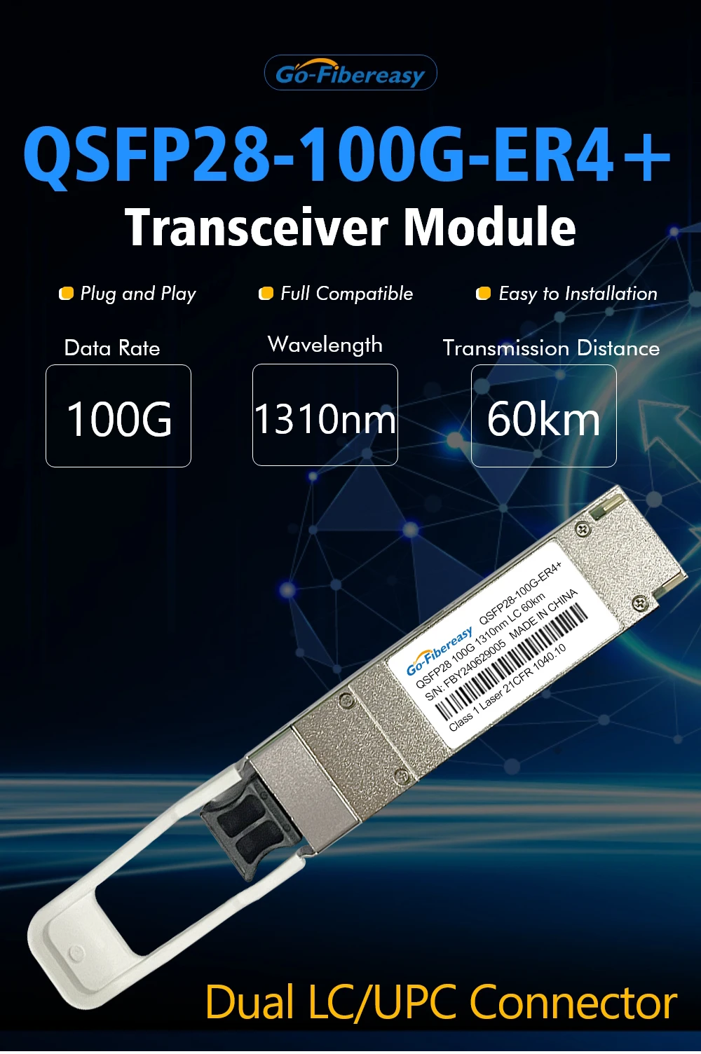 Módulo transceptor QSFP28-100G-ER4-60km QSFP28 100GBASE-ER4+ SMF 1310nm 60km Conector LC/UPC dúplex