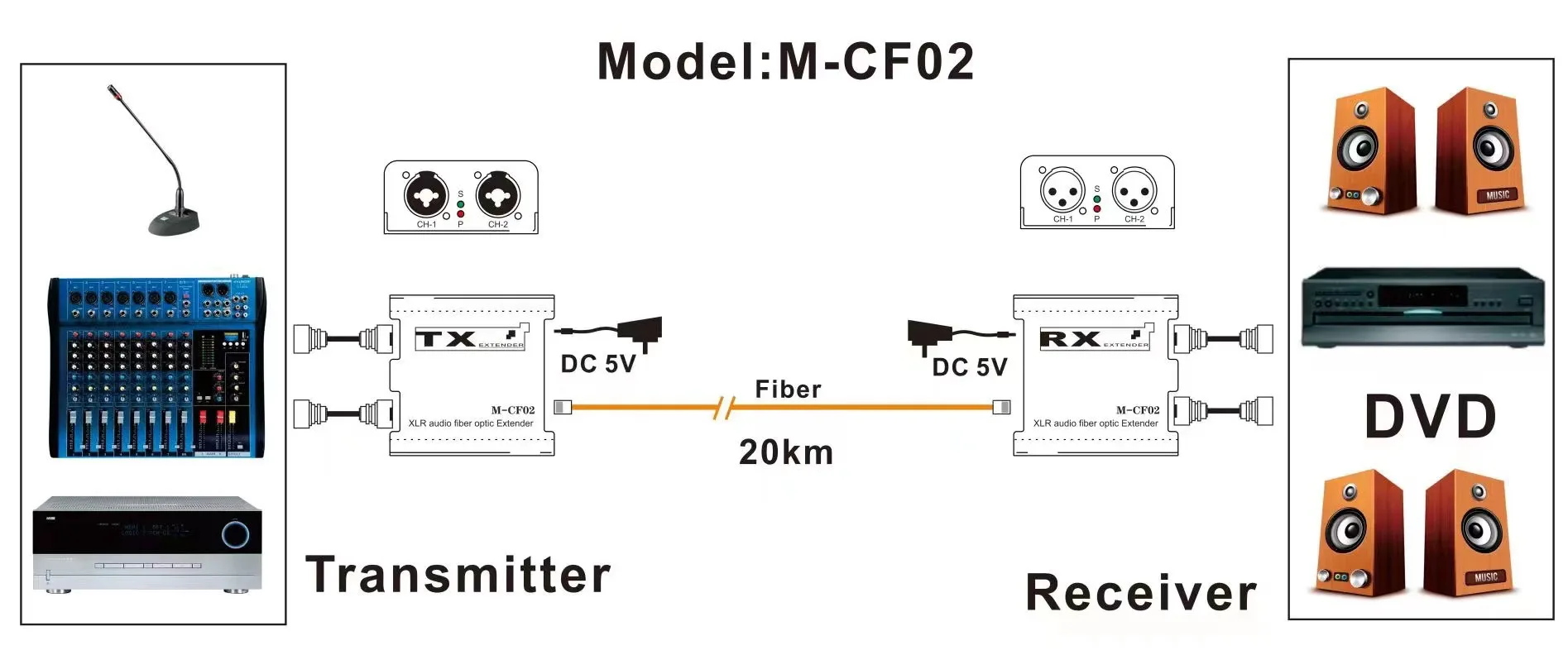 Transmisión de fibra óptica de audio XLR unidireccional bidireccional, la distancia predeterminada es de 20km (0-120km opcional);