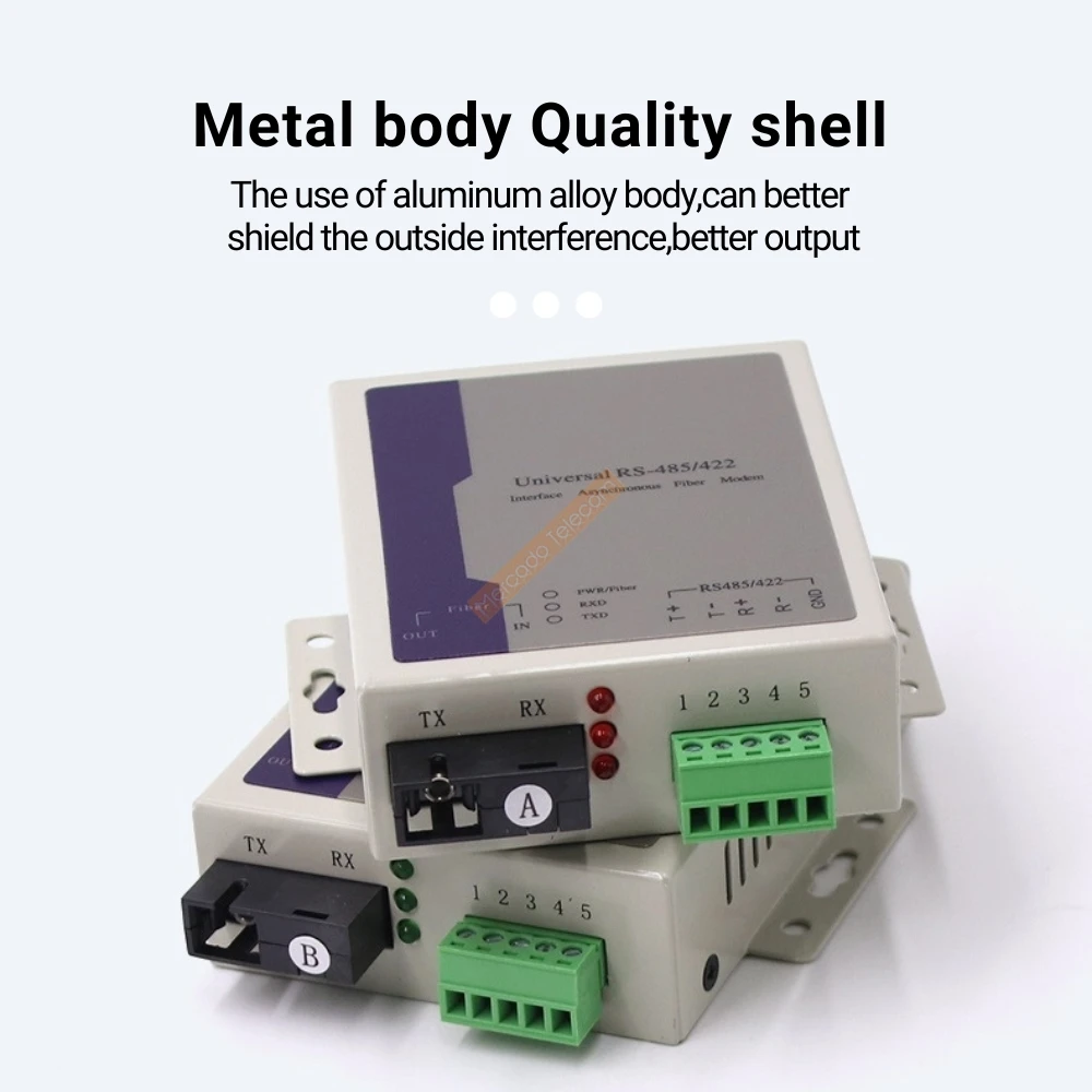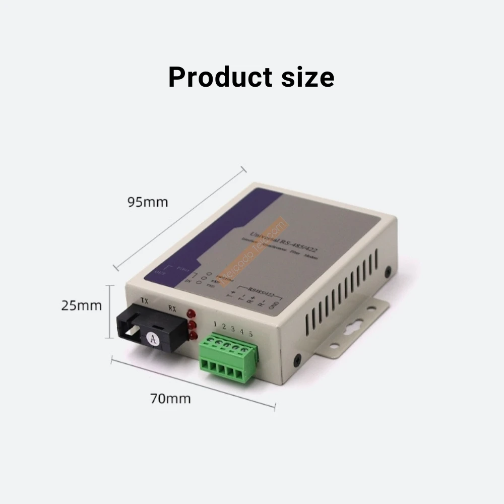 8. Aplicaciones: Control de automatización industrial, control de acceso, tarjeta, estacionamiento y otros sistemasSeñal de RS-485T +, T-, GNDT +, T-, GNDR +, R-, T +, T-, GNDSeñal de fibra ópticaENTRADA. SALIDAEstilo DE TRABAJOTrabajando asincrónicamente, peer-to-peerControl de direcciónControl automático de datos y tecnología de control automático para identificar y controlar automáticamente la dirección de transmisión de datosTasa baudios0-500Kbps, detección automática de la velocidad de la señalFibra longitud de onda1310nm/1550mmDistancia de transmisión del puerto eléctricoDistancia de transmisión del puerto eléctricoDistancia de transmisión del puerto ópticoCapacidad de cargaEl PUERTO DE admite 32 nodos (se puede personalizar 128 puntos)Forma de Puerto eléctricoBloque terminal de 5 posiciones