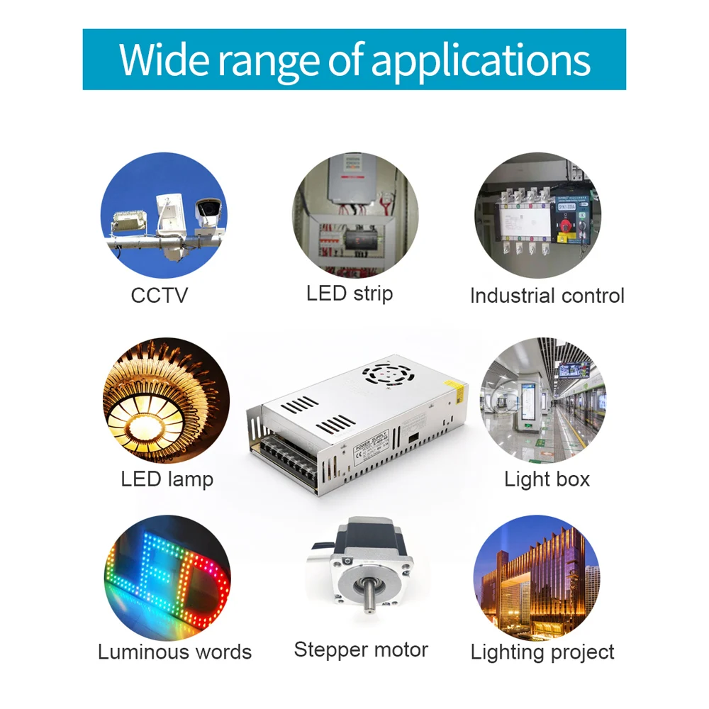 Transformer AC 220V To DC 12V 24V 36V 48V Switching Power Supply Source 360W 400W 500W 600W SMPS For LED Strip Light CCTV MotorSwitching power supplyInput voltage: AC 110V/220V ± 15% (universal for global voltage)Output power:360W/400W/500W/600WOutput current: follow the laws of physics, Current (mpere)=Power (att)/Vltage (volt).To ensure the lifetime of the power supply, pls don't use full load when you use it. We recommend the use power should be 80% of the rated power.For example: the label of the power supply is 600W, use power should be : 600W*80%=480WFeature&Advantages:Brand:LincoiahHigh efficiency, high reliability and low cost Switch input voltage range choice 100% full load and machine test Protection characteristics: short circuit/overload protectionCooling by fanSize: 215 x 115 x 50(mm)