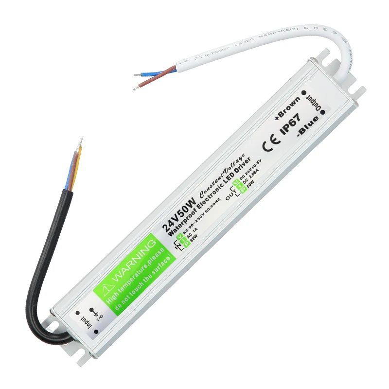 Transformador de iluminación 90-250V AC a DC 24V 50W 2.08A Adaptador de controlador LED Aluminio IP67 Fuente de alimentación conmutada impermeable para exteriores