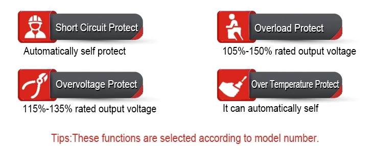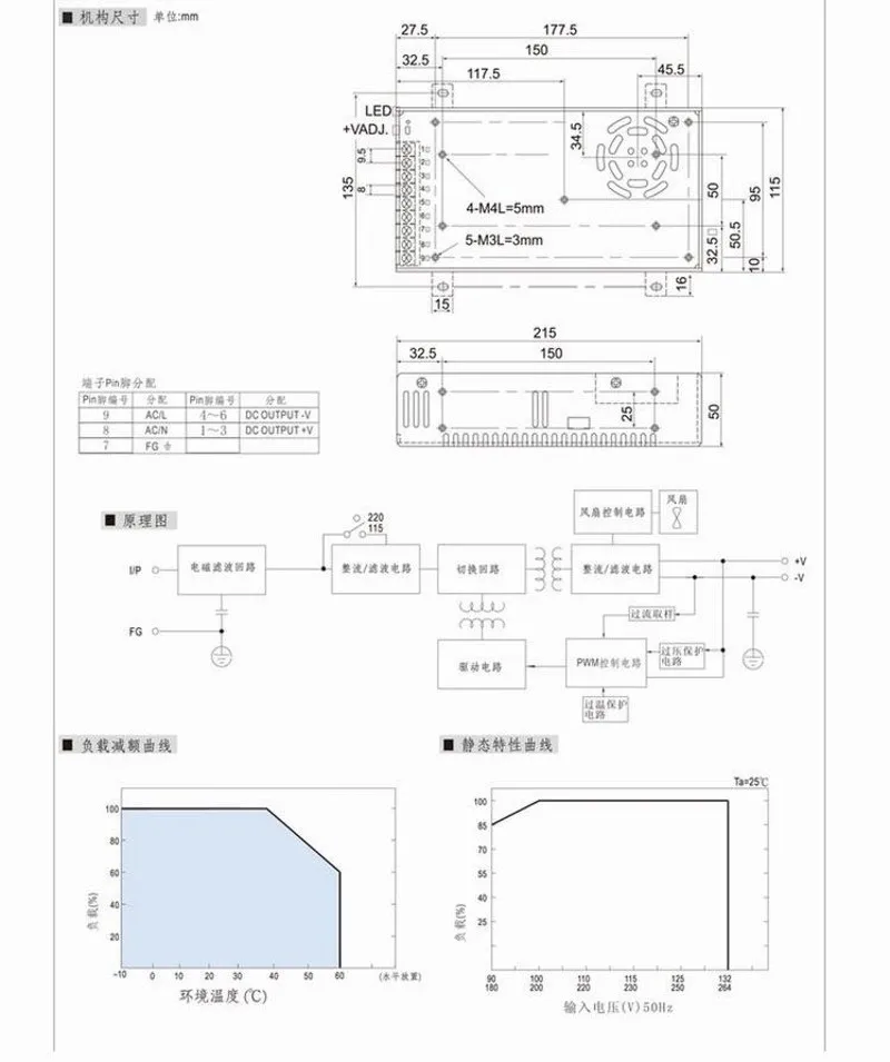 Atención especial: si utiliza carga inductiva como motor o ventilador, preste atención al parámetro de corriente de arranque del motor.Este parámetro no debe ser superior a la corriente de la fuente de alimentación.De lo contrario, la fuente de alimentación podría dañarse.Debe seleccionar una fuente de alimentación de corriente más alta o proporcionar protección de arranque suave para el motor.El circuito absorbe la corriente de entrada. Fórmula de potencia) voltaje X corriente=potencia Descripción del terminal y método de cableado. Terminal de entrada de CA L, N Marca de tierra FG Terminal positivo de salida de CC V+ Terminal negativo de salida V-DC potenciómetro ajustable ADJ Salida de ajuste fino Voltaje CC ● Entrada de voltaje completo ● Miniaturización ● Función de protección Cortocircuito/sobrecarga/sobretensión ● Prueba de envejecimiento 100% a plena carga Rango de voltaje y frecuencia de entrada----------110V/220VAC/47 ~ 63 Hz Inicie la sobretensión actual---------------20A@120VAC (arranque en frío) Rango de ajuste de salida--------------- ±100% (voltaje de salida nominal) Protección contra sobrecarga-------------------105%~200% (carga nominal), autorrecuperación Protección contra sobretensión-------------------115%~135% (voltaje de salida nominal) Protección contra cortocircuitos------------------- autorrecuperación Tiempo de inicio de salida--------------- ≤ 2S@120VAC ≤1,0S@230VAC Tiempo de espera de salida--------------- ≥ 10mS@120VAC, ≥20mS@230VAC Fuerza de aislamiento------------------- Entrada - Salida: AC1500V, 1min Entrada - carcasa: AC1500V, 1min Salida - Caja: DC500V, 1min Entorno de trabajo ------------------ -10 ° C ~ 50 ° C; 20% ~ 90% RH (sin condensación)
