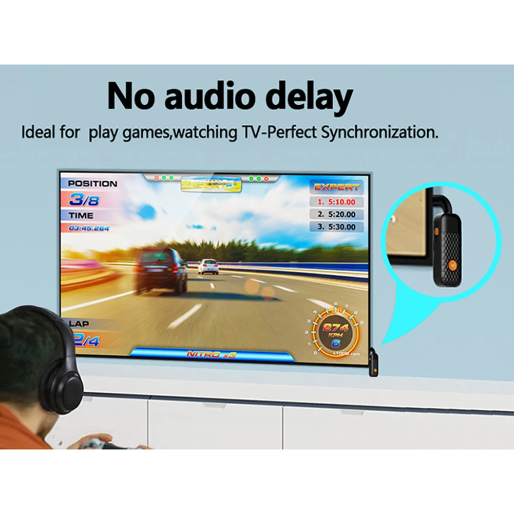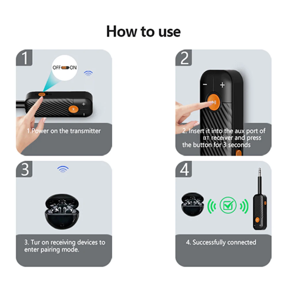 5. Escucha de música sin latencia:La tecnología 5,2 Compatible con Bluetooth en este transmisor de audio garantiza una conexión estable con baja latencia que le permite disfrutar de su música sin ningún retraso. El bajo consumo de energía y la transmisión de señal estable garantizan calidad, llamadas manos libres, plug and play, interfaz AUX.