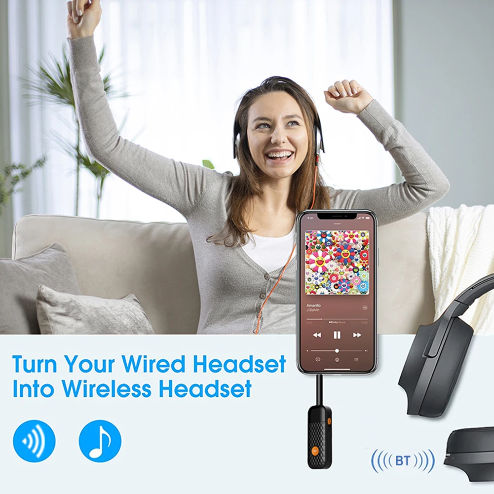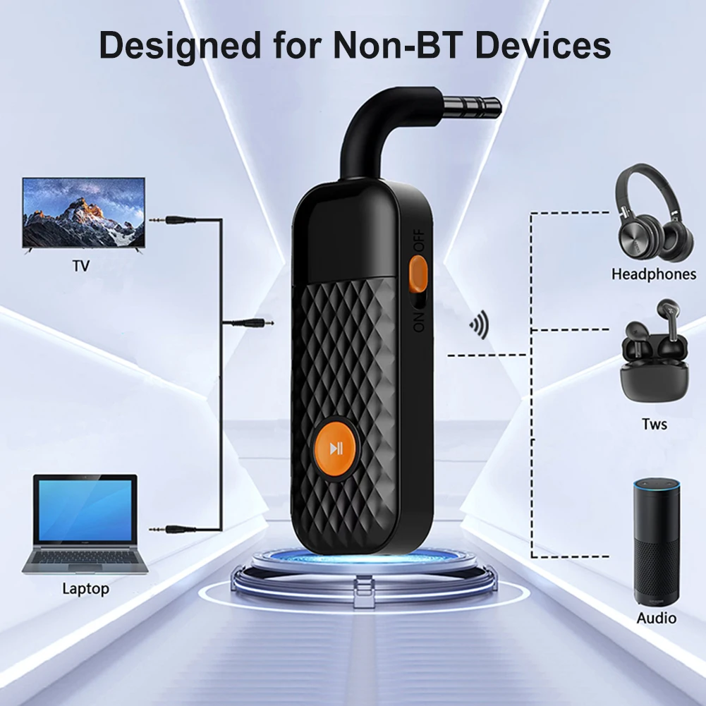 5. Escucha de música sin latencia:La tecnología 5,2 Compatible con Bluetooth en este transmisor de audio garantiza una conexión estable con baja latencia que le permite disfrutar de su música sin ningún retraso. El bajo consumo de energía y la transmisión de señal estable garantizan calidad, llamadas manos libres, plug and play, interfaz AUX.