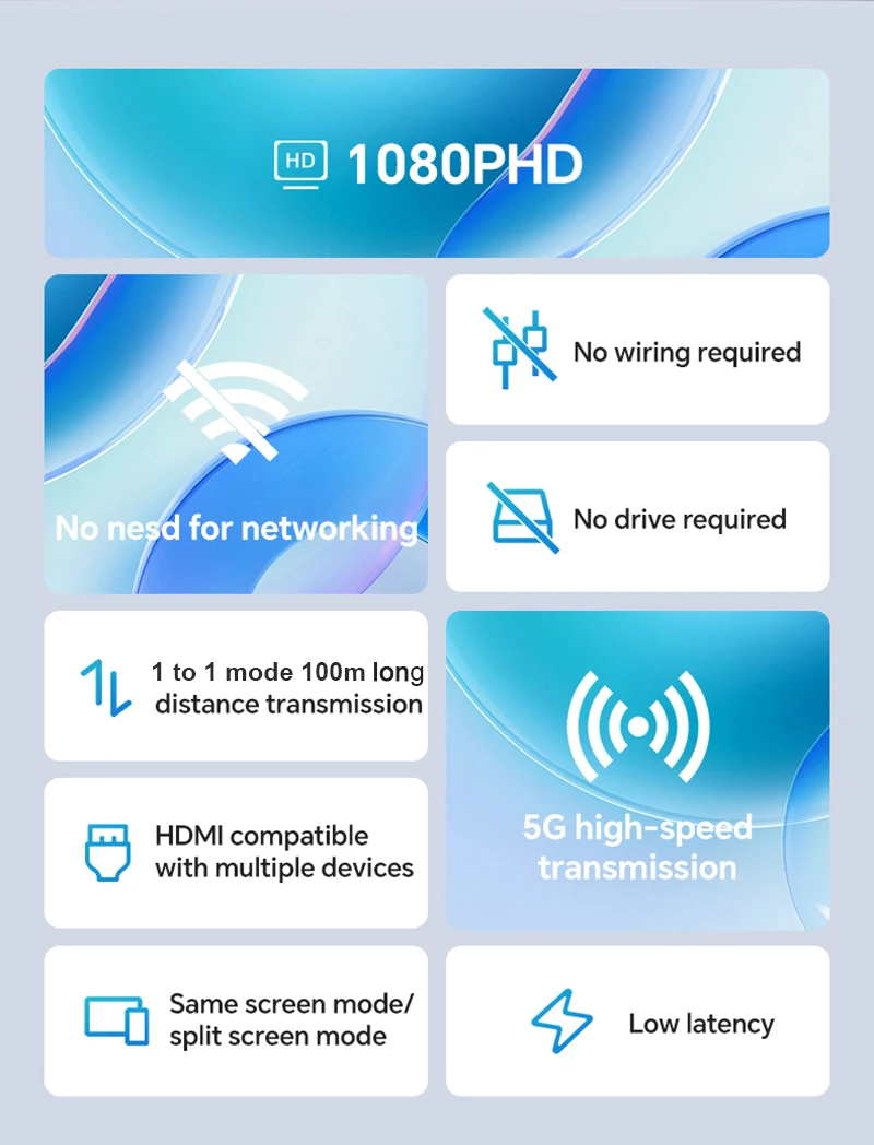 1.Transmisión de audio y vídeo HDMI a través del protocolo de transmisión inalámbrica incorporado, sin necesidad de wifi ni Internet