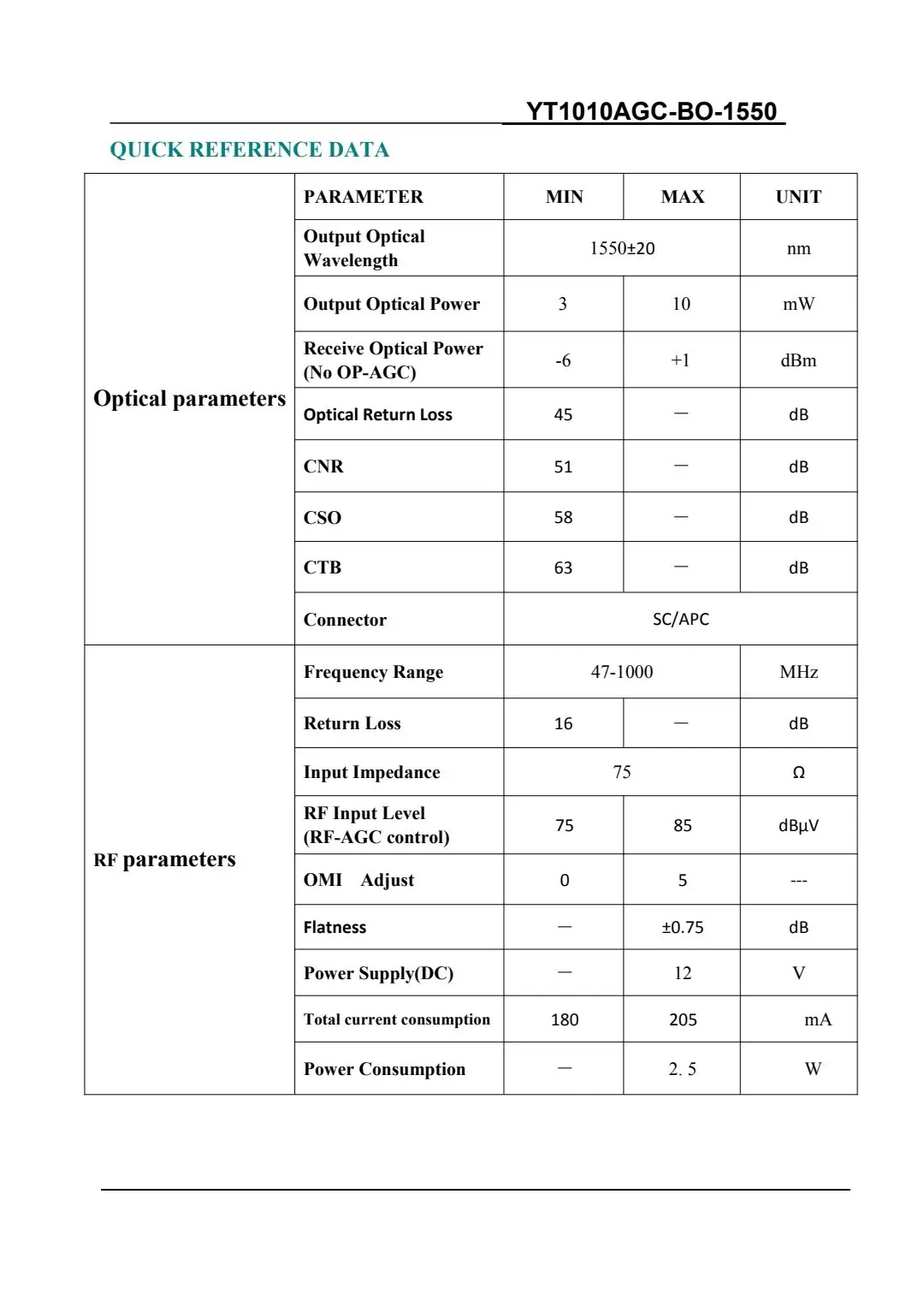Modelo: 1010AGC-BO-1550, transmisor de fibra óptica de modulación directa con AGC