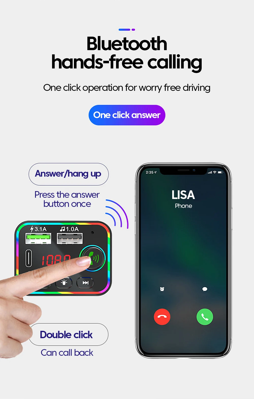 1: Llamadas manos libres Bluetooth Puerto USB/PD con función de carga 3.1A