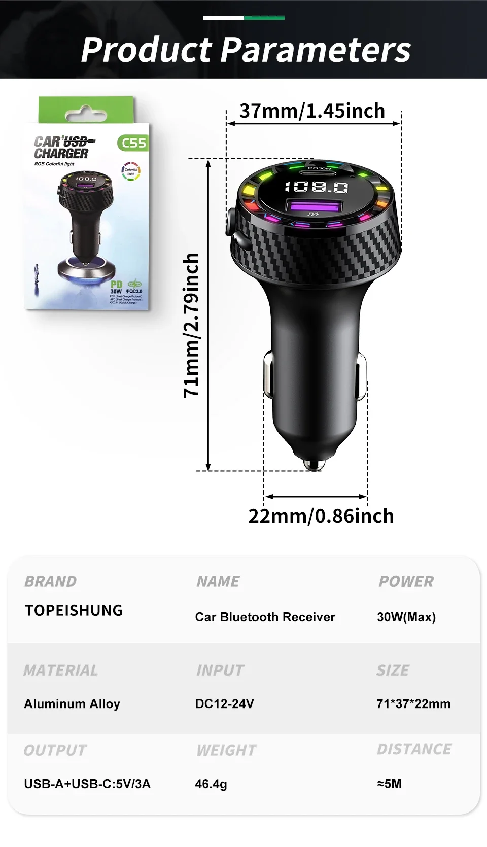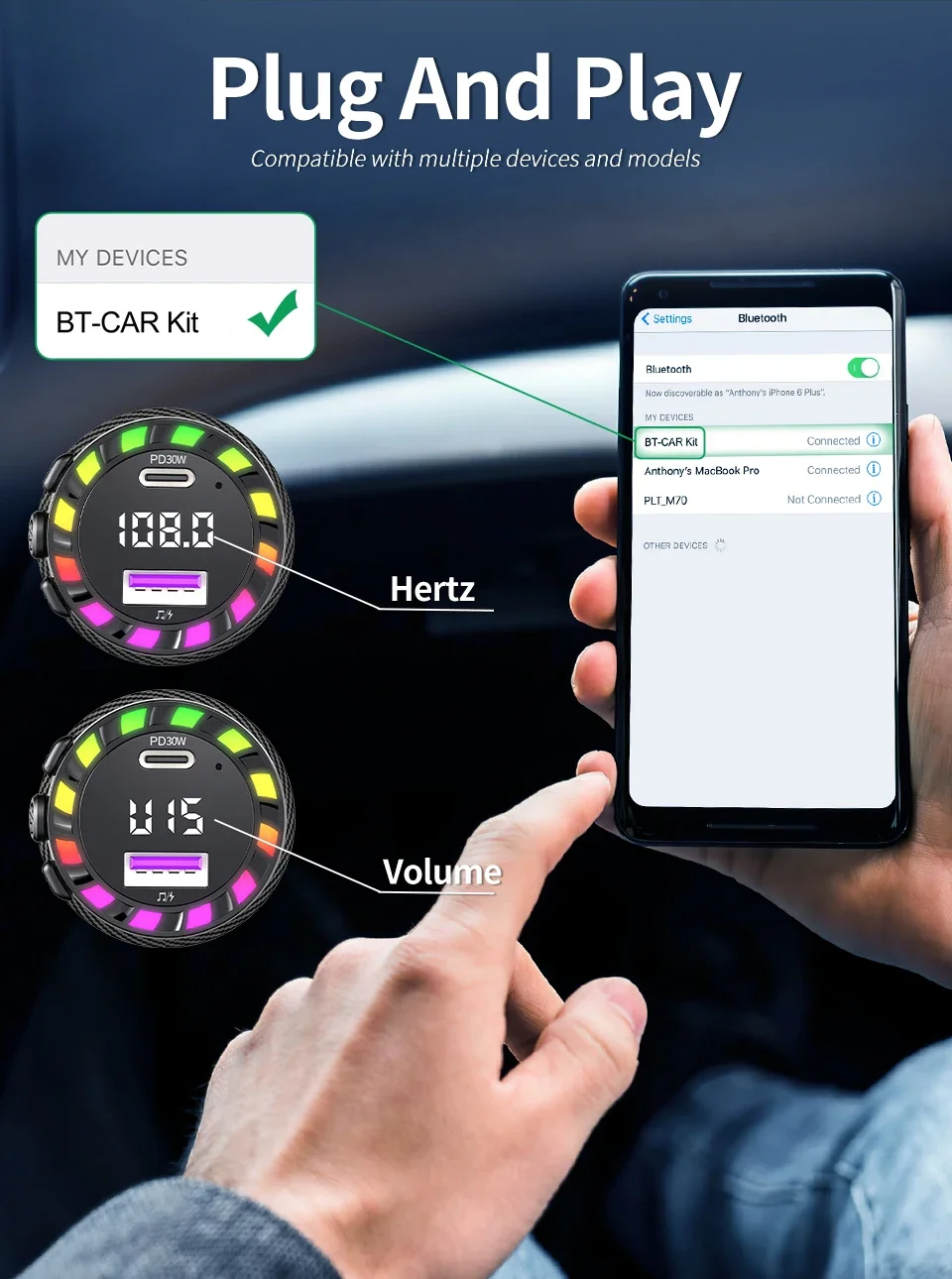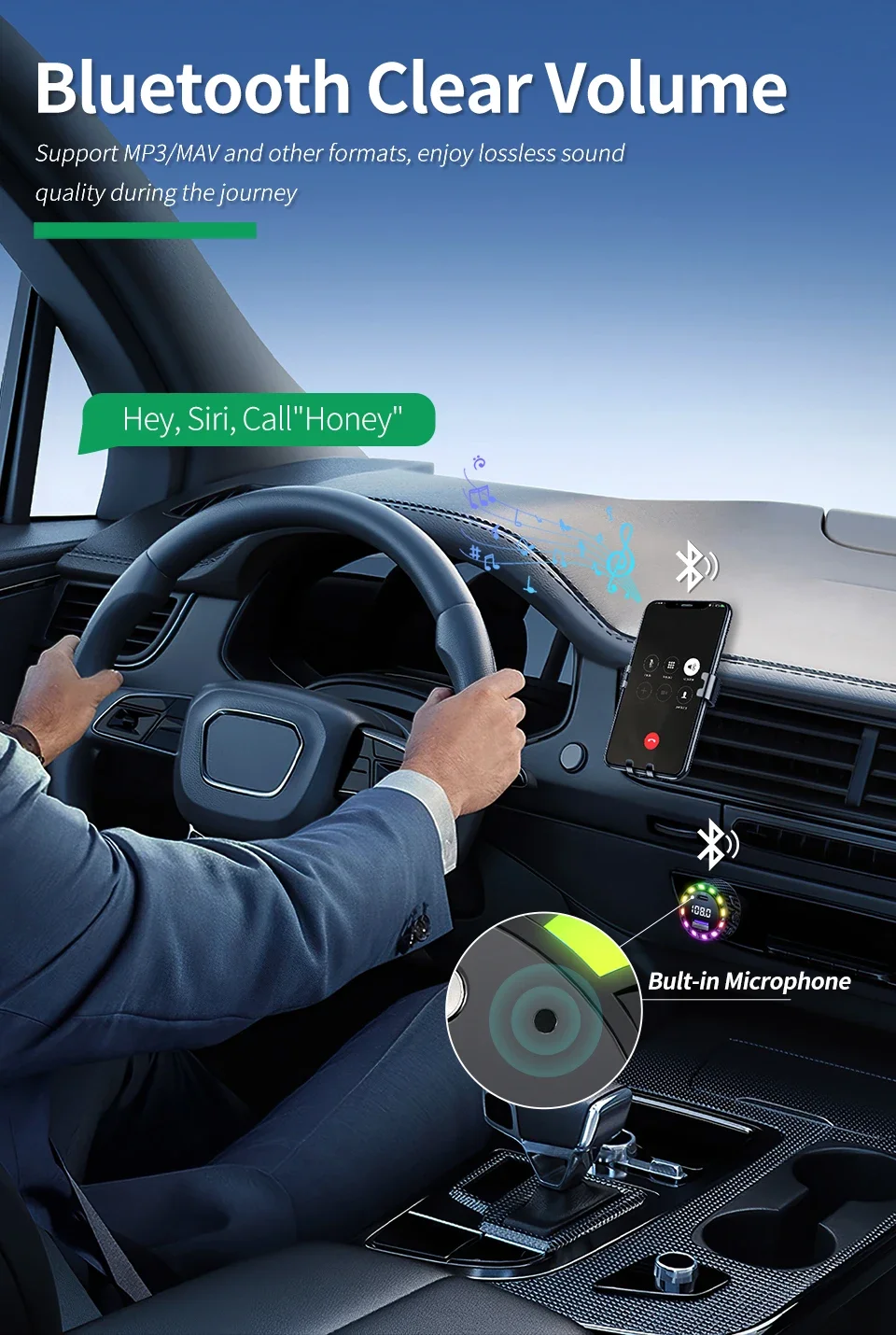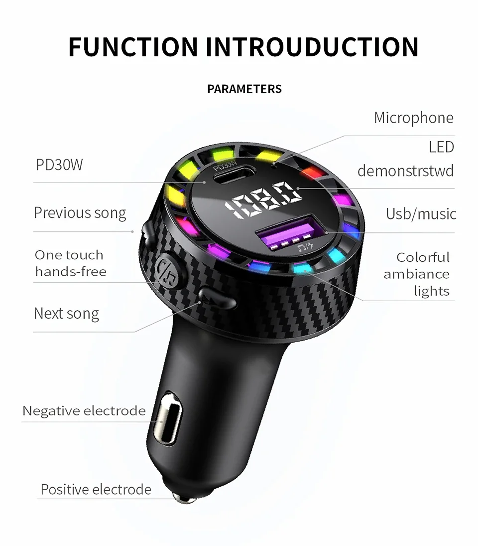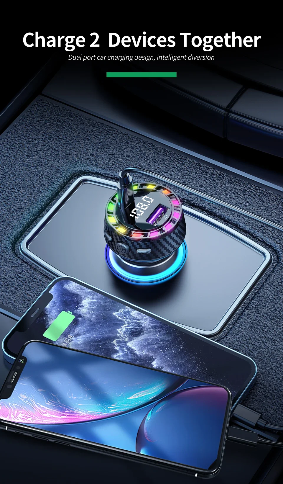 Transmisor FM Bluetooth 5,3 para coche, cargador de coche, Audio, USB Dual tipo C, cargador rápido, luz colorida, reproductor MP3 manos libres