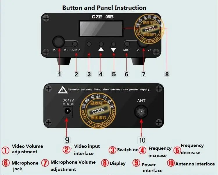 - Connect antenna first ,then connect the power supply, otherwise, transmitter will be burned out.