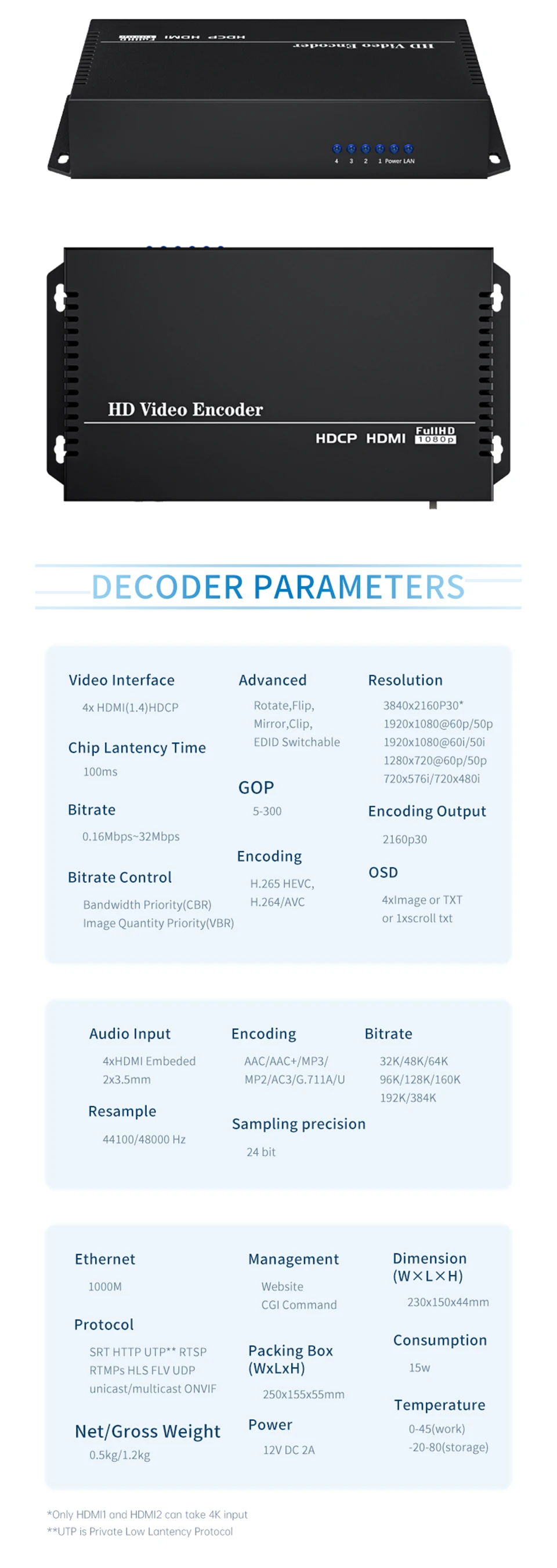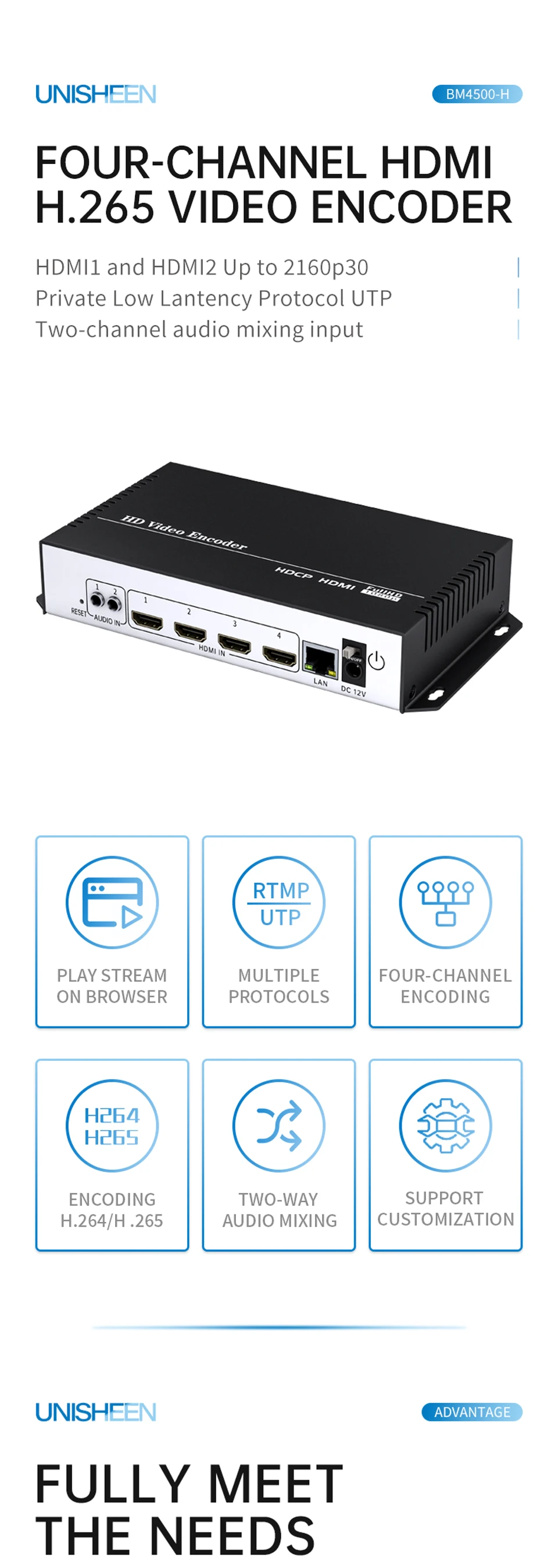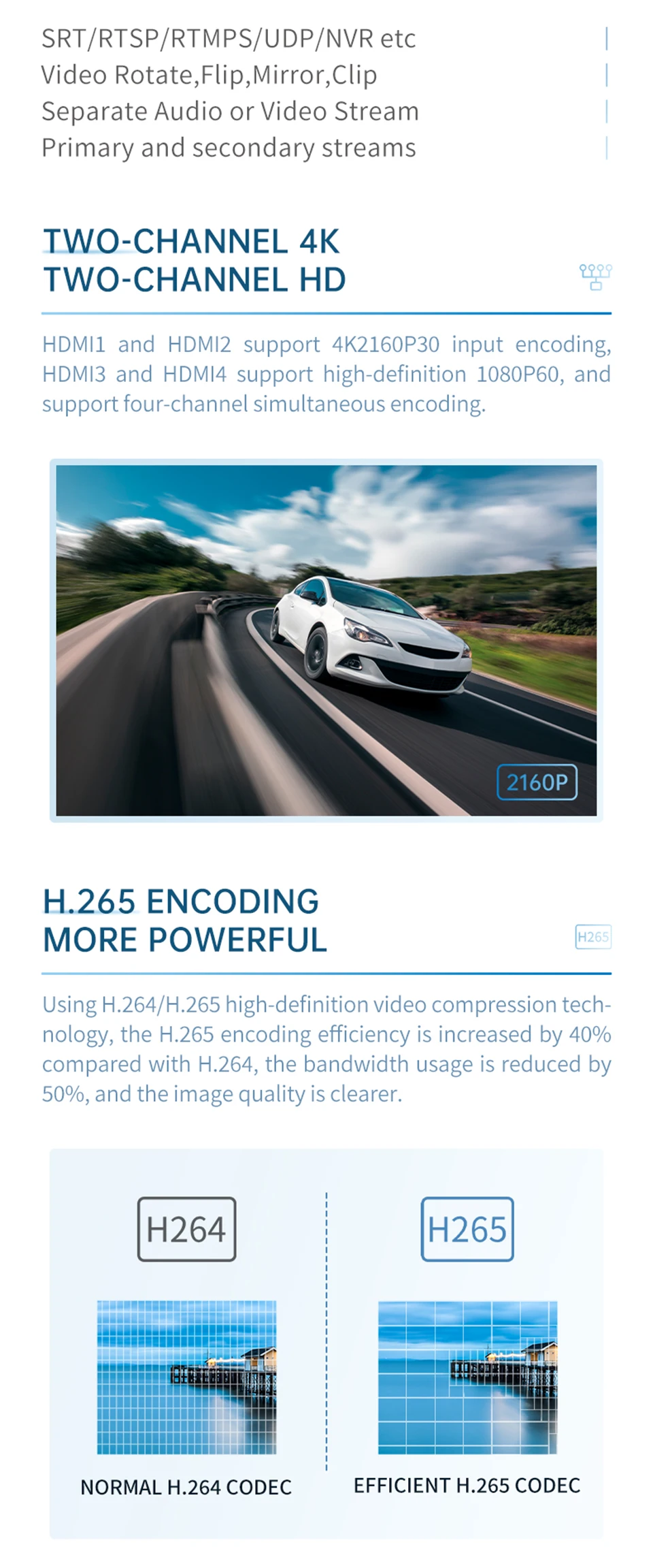 * HDMI1 y HDMI hasta 2160p30 * EDID conmutable * SRT/RTSP/RTMPS/UDP/NVR, etc. * Protocolo privado de baja latencia UTP * Rotación de vídeo, Flip,Mirror, clip * Transmisión de audio o video separada * Reproducir transmisión en el navegador * Personalizable