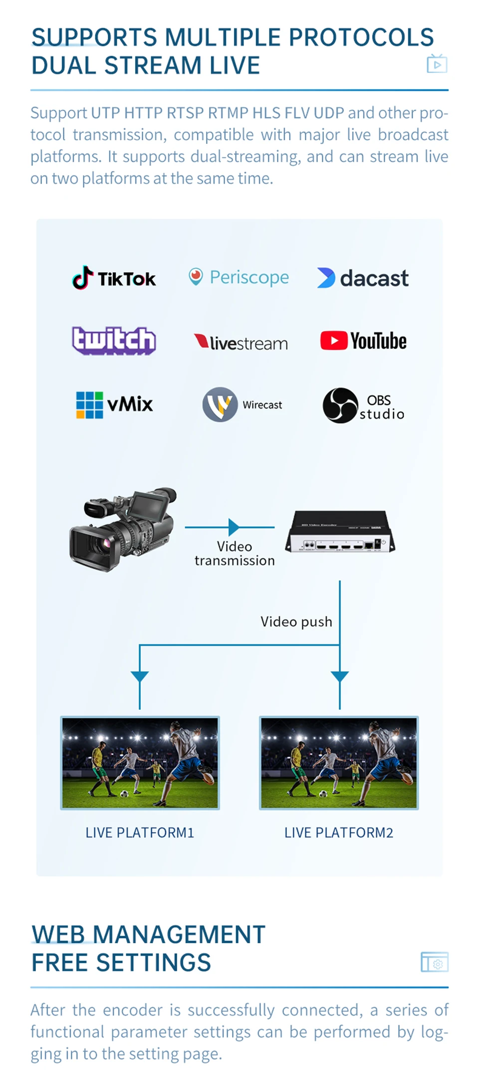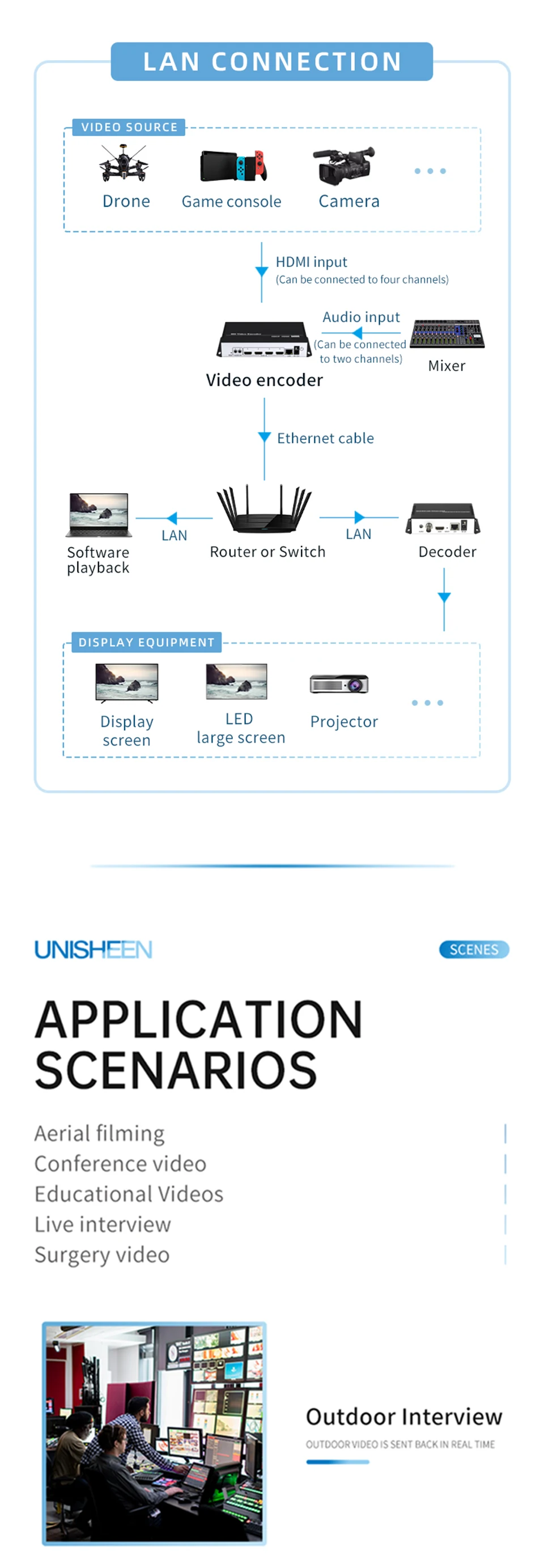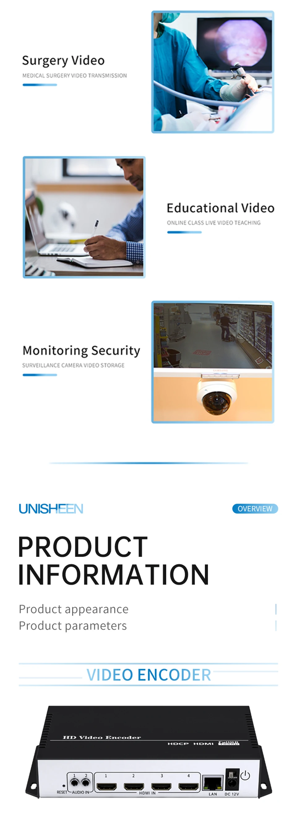 * HDMI1 y HDMI hasta 2160p30 * EDID conmutable * SRT/RTSP/RTMPS/UDP/NVR, etc. * Protocolo privado de baja latencia UTP * Rotación de vídeo, Flip,Mirror, clip * Transmisión de audio o video separada * Reproducir transmisión en el navegador * Personalizable