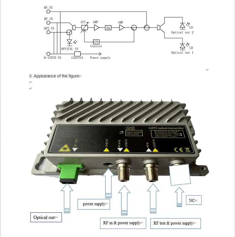 2. Adopta el módulo GaAs como módulo amplificador RF, el rango de recepción óptica puede alcanzar 0 ~-15DBM, el rango de entrada RF es 75 ~ 85dbuV.