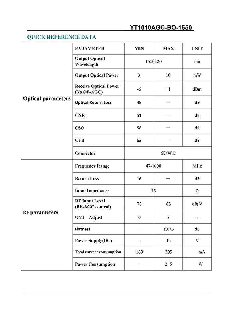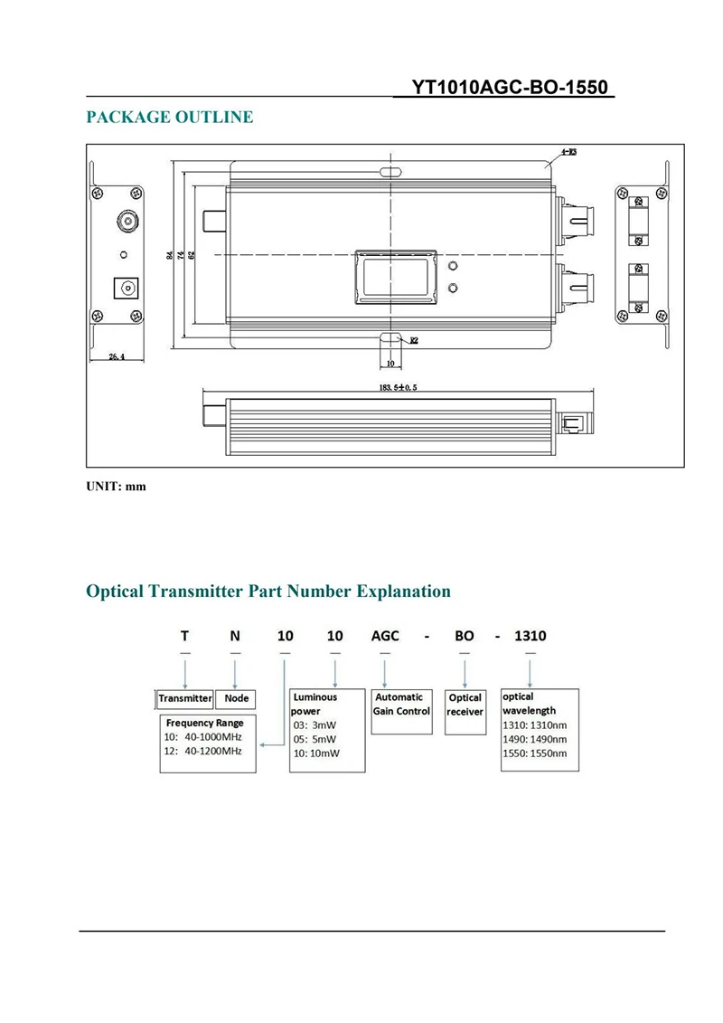 La función del transmisor óptico es convertir la señal de TV AM RF enviada por el extremo frontal en una señal óptica y transmitir la señal óptica a la distancia a través de la fibra óptica.