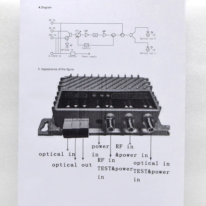 2. Adopta el módulo GaAs como módulo amplificador RF, el rango de recepción óptica puede alcanzar 0 ~-15DBM, el rango de entrada RF es 75 ~ 85dbuV.