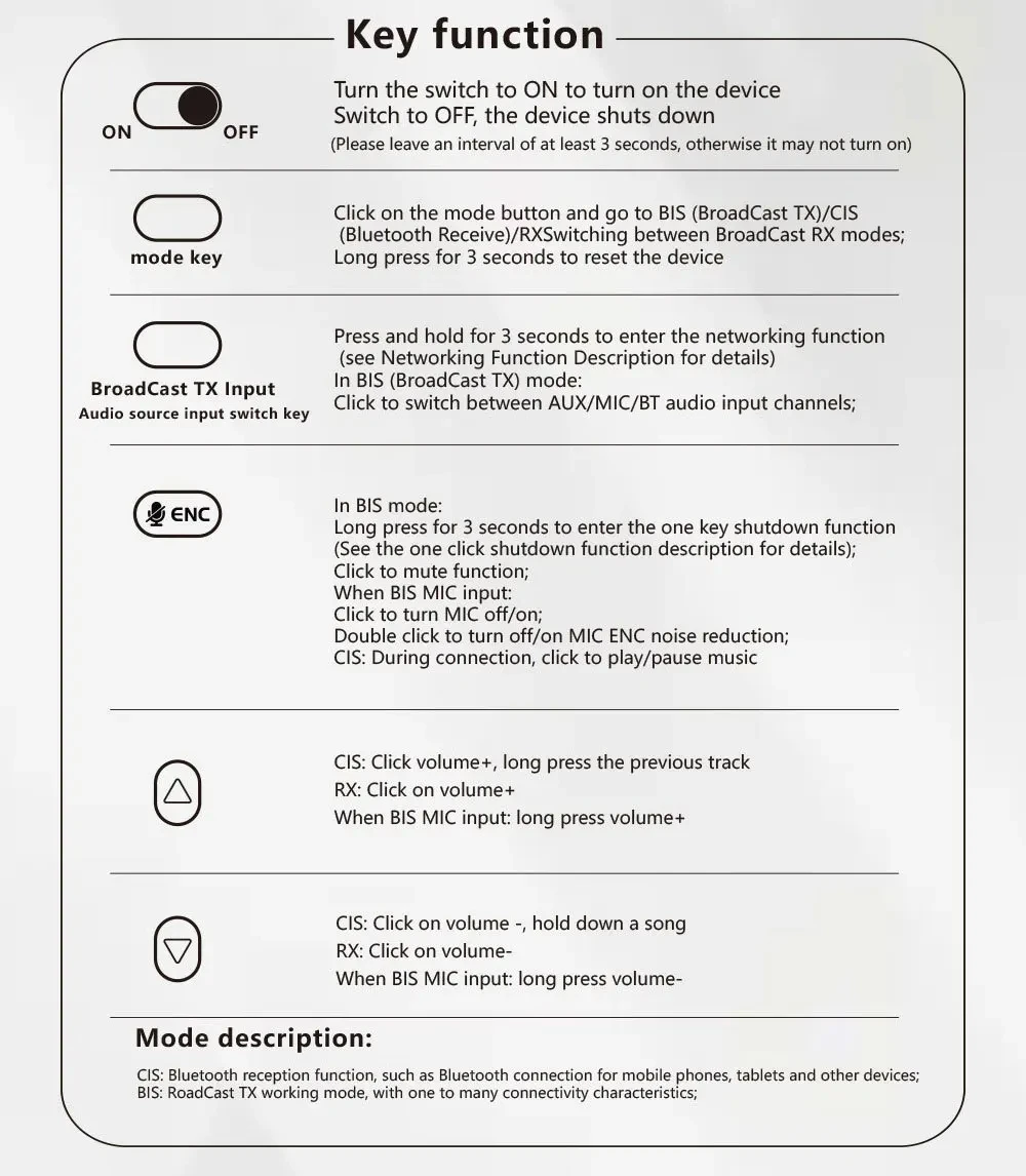 Mode:Bluetooth audio receiver,Bluetooth broadcast receiver,Bluetooth broadcast transmitter