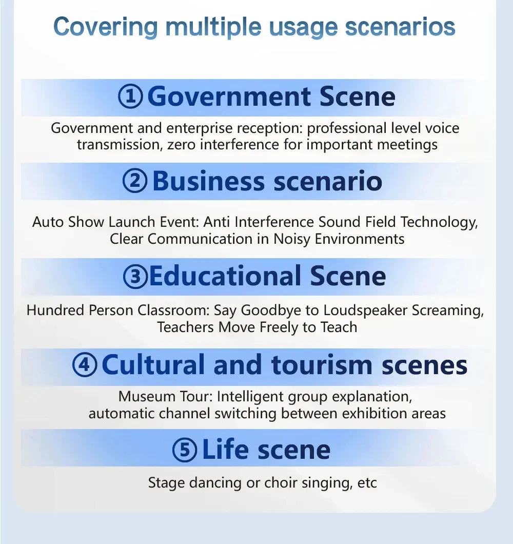 8.Suitable for multiple scenarios,ou can use it to receive announcements in subways, airports, exhibitions, as an intercom system for tour guides, for teaching or in conference rooms.