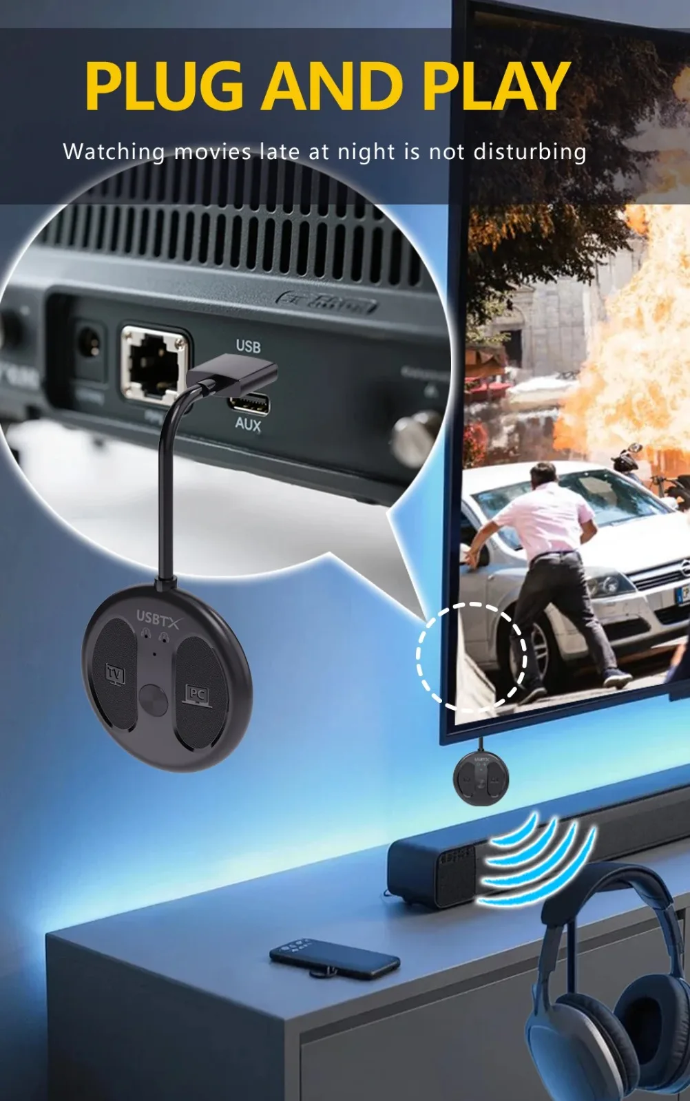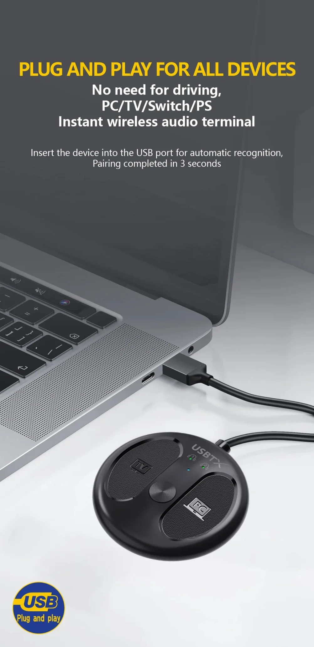 4.Plug and play, no es necesario instalar ningún controlador, simplemente conecte este transmisor de audio al puerto USB de su dispositivo y comience a conectarse inmediatamente. Es compatible con Windows Xp/7/8/10/11, tu macOS. Tenga en cuenta: NO es compatible con iOS, Android, su sistema operativo iPad.