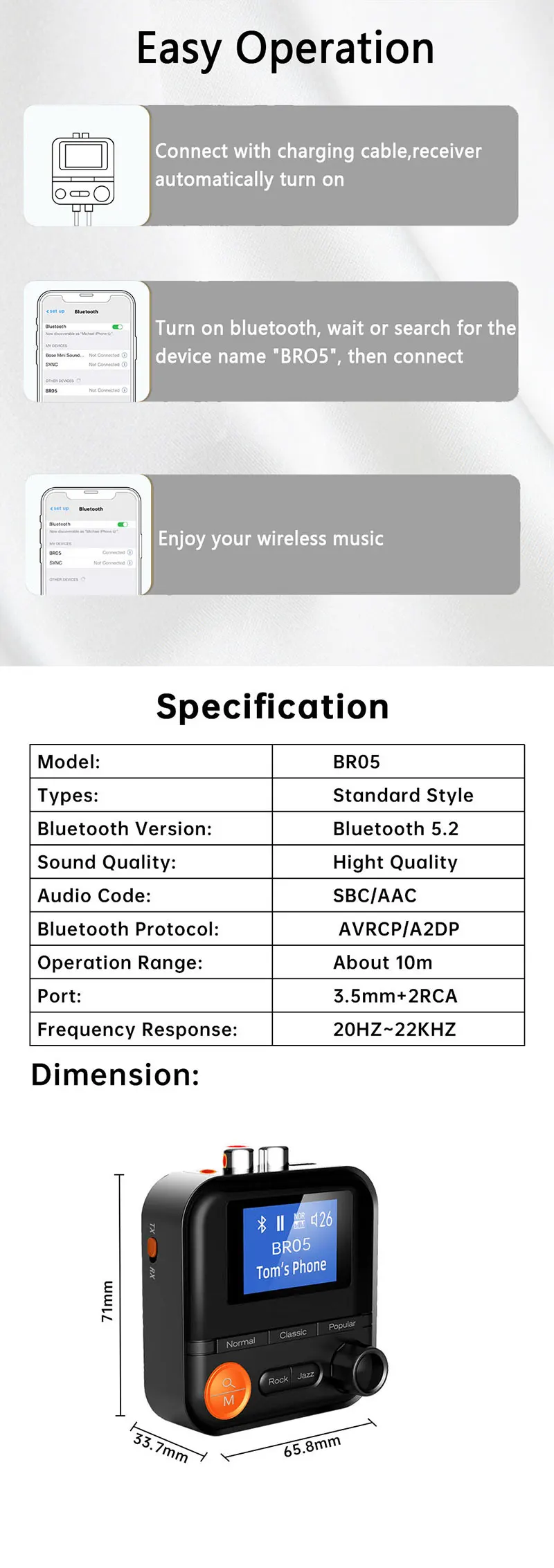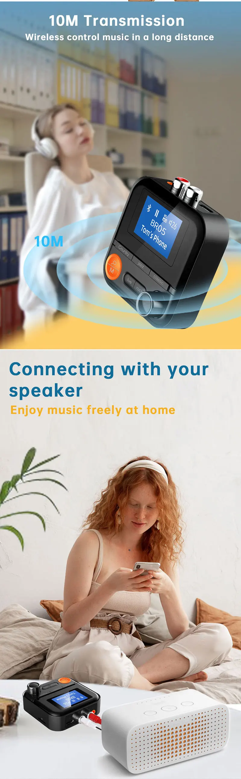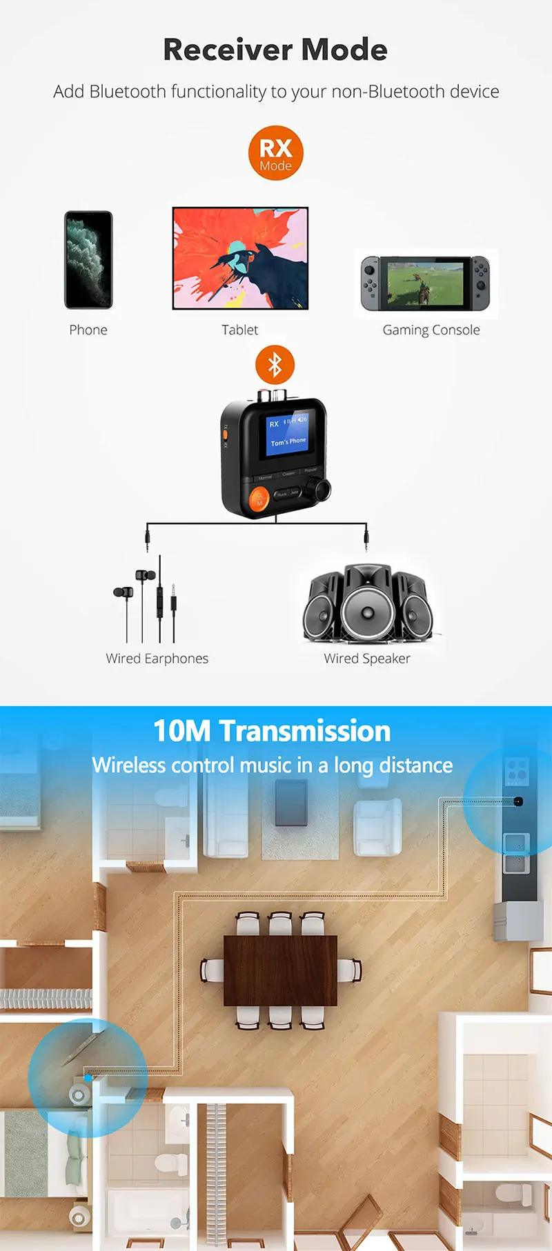 7.Easy to Use: Just tap the switch to switch between transmitter and receiver modes. Easy connection using advanced Bluetooth technology and 3.5mm audio cable (included) and 2RCA Audio Cable.