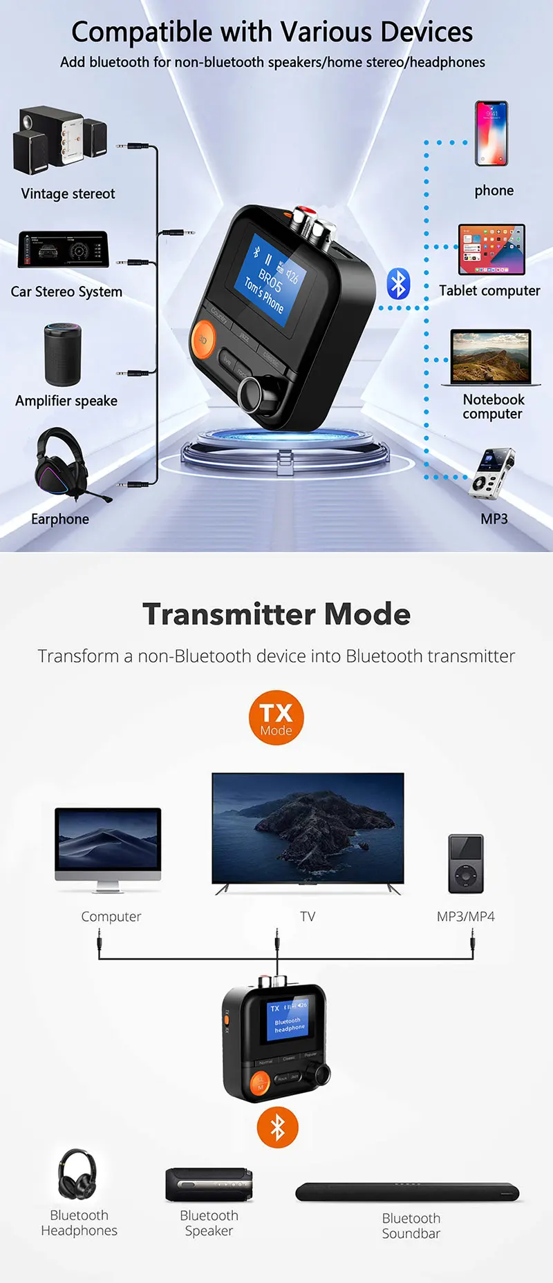 2 in 1 Bluetooth 5.2 Audio Adapter: The Vaorlo Bluetooth-5.2 audio transmitter receiver can transmit audio from non-Bluetooth-compatible audio sources (TV, PC, MP3, CD player or book reader, etc.) to Bluetooth headsets and speakers. And you can also make your non-Bluetooth-compatible headsets and speakers receive audio from Bluetooth-compatible audio sources (mobile phones, tablets, etc.). You can easily switch between transmitter and receiver modes with the push of a button.