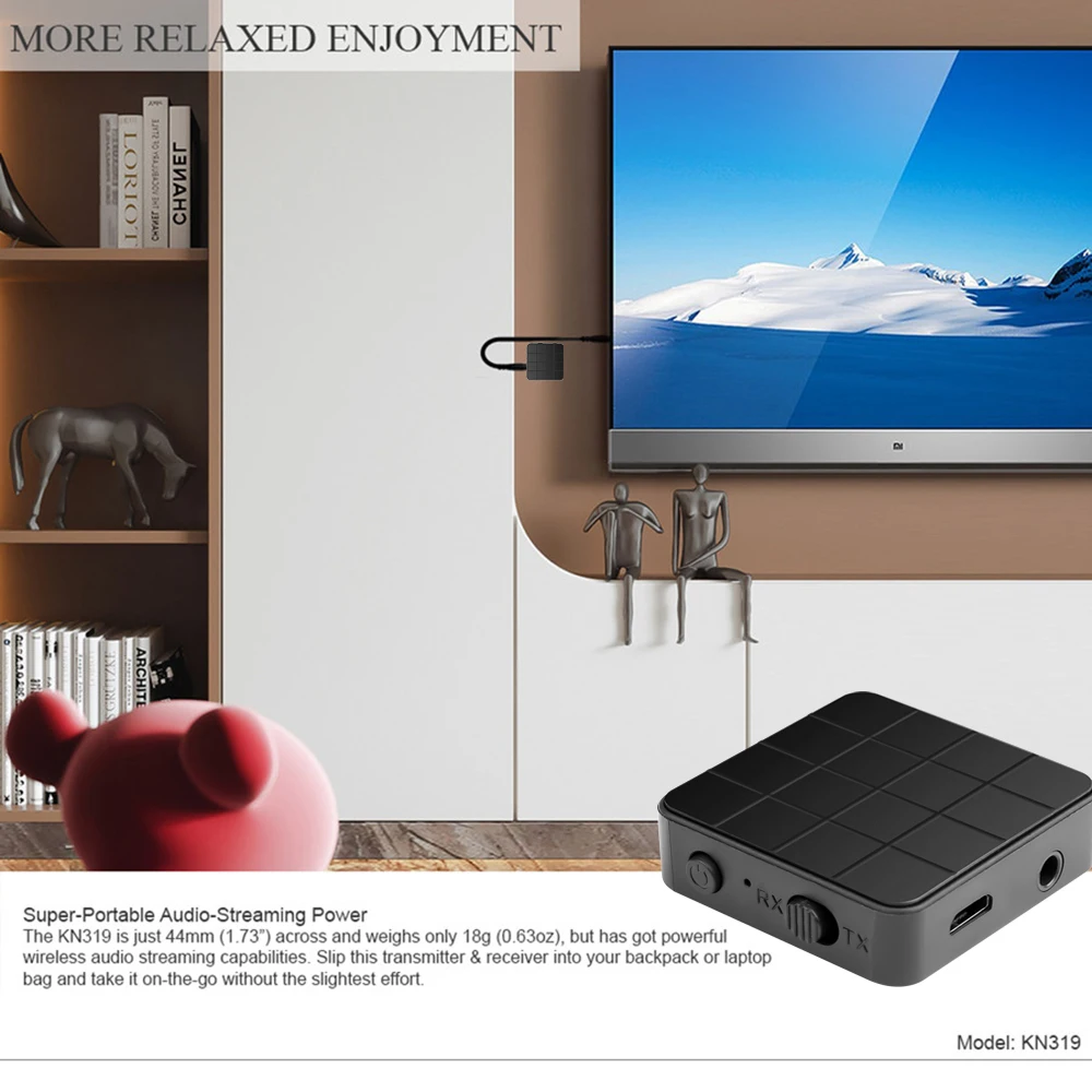 Transmite audio de forma inalámbrica desde su televisor, sistema estéreo doméstico o reproductor de CD sin Bluetooth a sus auriculares o parlantes Bluetooth.
