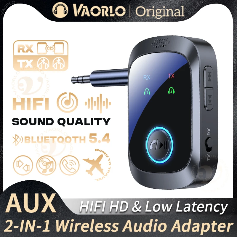 Comprar Transmisor y receptor de audio Bluetooth 5.4 de doble transmisión multipunto 2 en 1, adaptador inalámbrico de baja latencia HIFI HD de 3,5 mm con micrófono para TV, PC, auriculares, coche y avión.