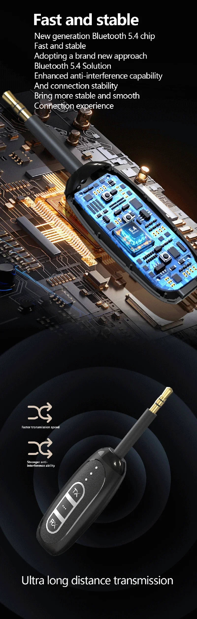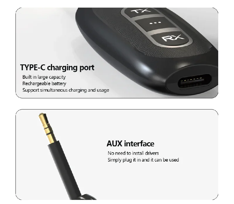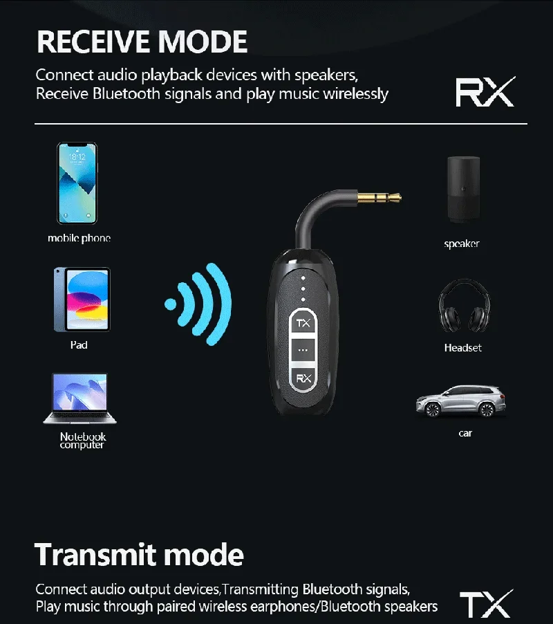 TX: Hay dos modos de trabajo: Bluetooth (luz verde TX encendida) y transmisión (luz azul TX encendida).Doble clic en el botón TX se puede cambiar entre los dos Cambios;