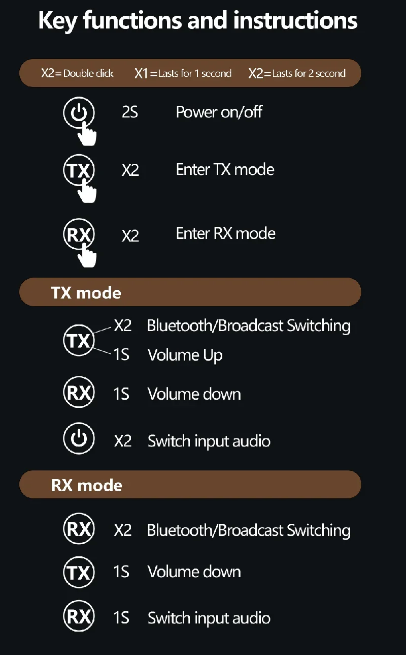 Cuando está en modo RX: haga doble clic en el botón RX para cambiar entre los modos de trabajo Bluetooth (luz verde RX encendida) y transmitir (luz azul RX encendida);